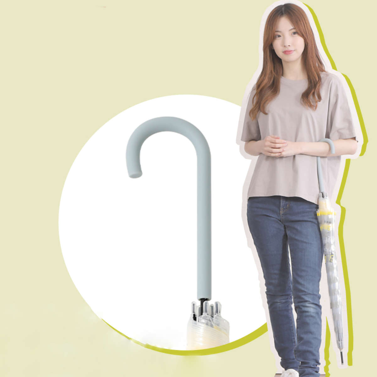 持ち手はベーシックな曲がり型で、手になじみやすく扱いやすい形状です。傘のデザインに合わせたカラフルな手元は、マットな質感で触り心地も心地よいです。