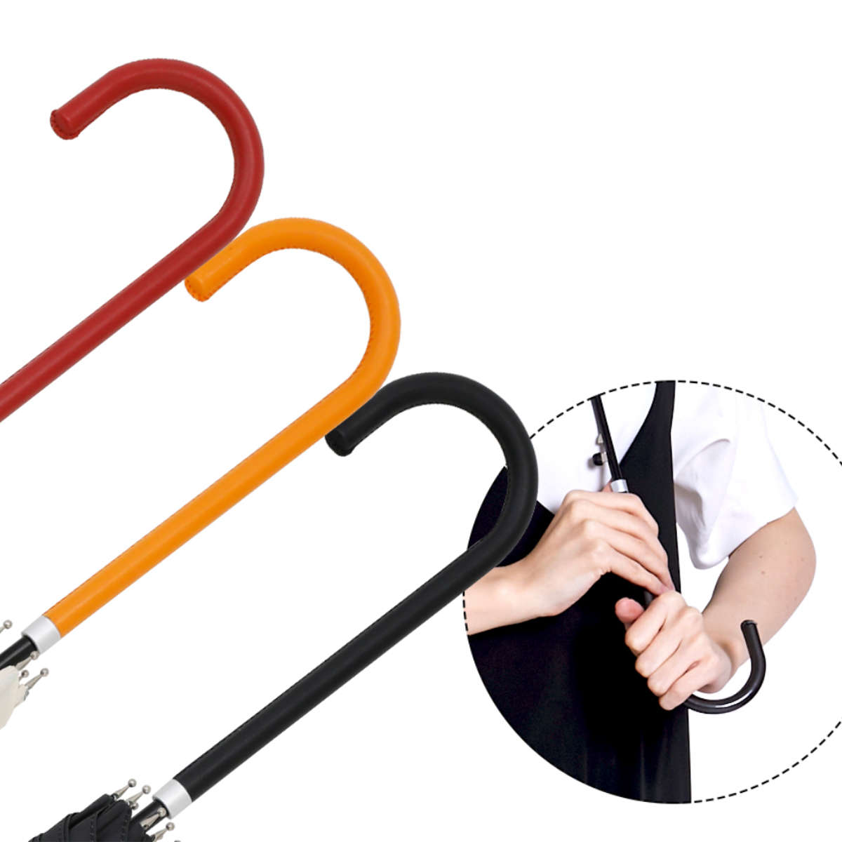 持ち手はベーシックな曲がり型で、手になじみやすく扱いやすい形状です。上質な合皮のしっとりとした質感と、すっきりとした細身のフォルムが、全体にやわらかな雰囲気を添えます。