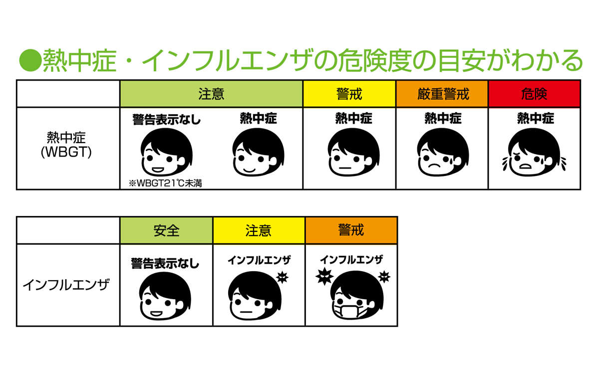 熱中症やインフルエンザの注意喚起を、表情アイコンでわかりやすくお知らせ。ひと目で予防の必要性が判断できるため、エアコン使用の判断が難しい高齢の方や、小さなお子様、ペットのいるご家庭にも安心です。