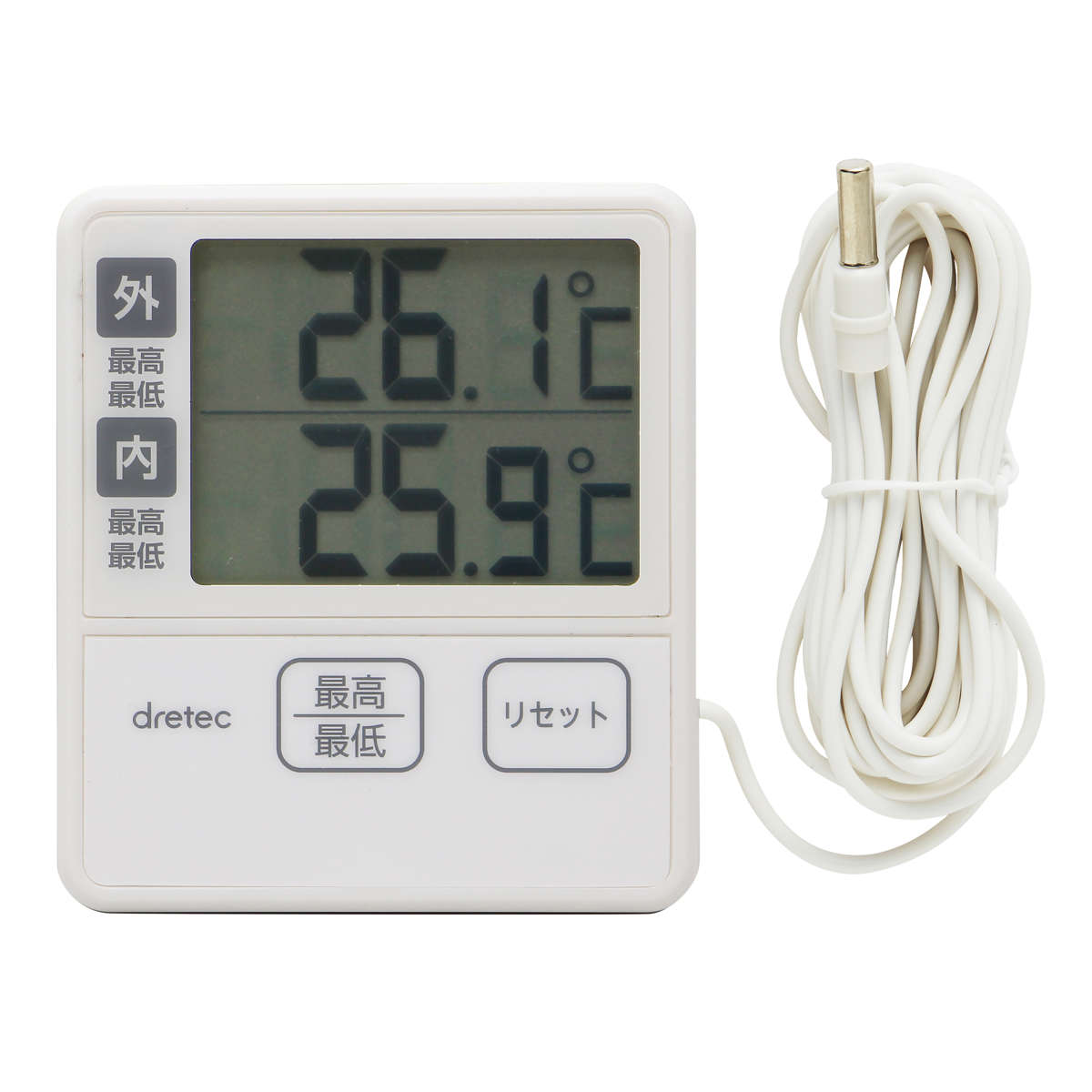 本体部と外部センサーによって、2カ所の温度を同時に表示できるセンサーコード付きの温度計です。外部センサーは-20度から測定可能で、冷蔵庫などの低温環境にも対応しています。