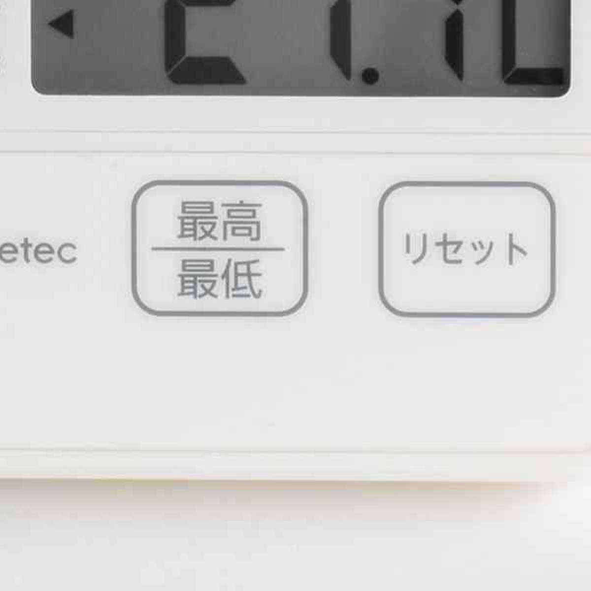 外部と内部の温度が一画面で見られます。最高・最低温度のメモリー付で「最高/最低」ボタンで確認できます。