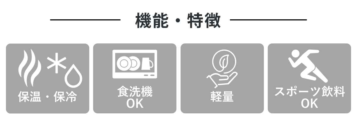 本体も含めた全パーツが食洗機に対応しているため、お手入れが簡単です。また、ステンレス製魔法びん構造なので高い保温・保冷力にも期待できます。通勤・通学・スポーツなどさまざまなシーンで、最適な温度を長時間楽しむことができます。