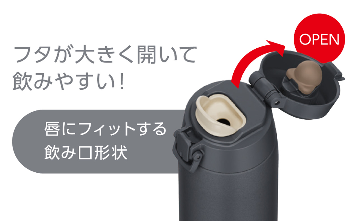 蓋は大きく開くため、飲みやすいです。飲み口は唇にフィットする形状で、使い心地は抜群です。