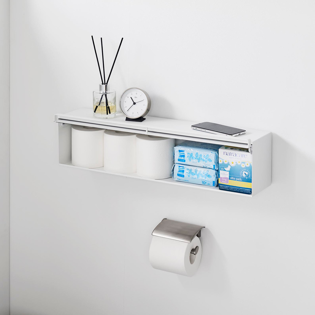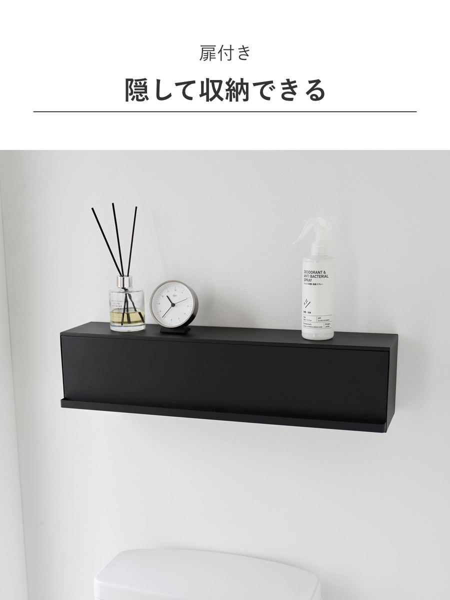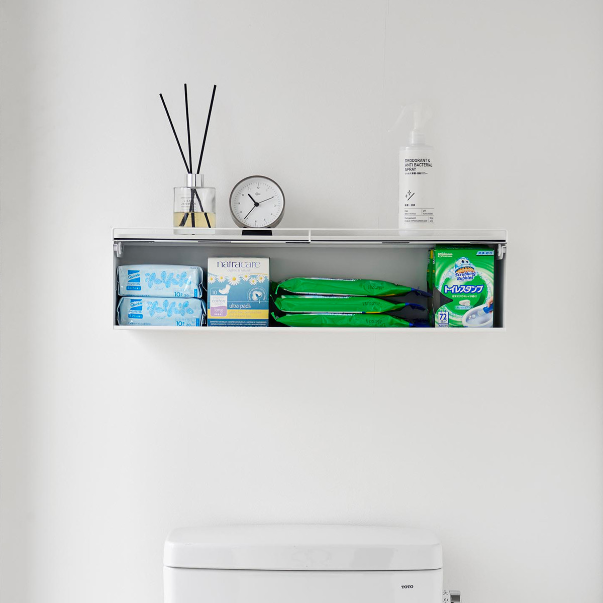 生活感の出るトイレ用品のストックをスッキリ隠して収納できます。扉は、手前に引き上げてから押し込む構造で、スムーズに開閉が可能です。