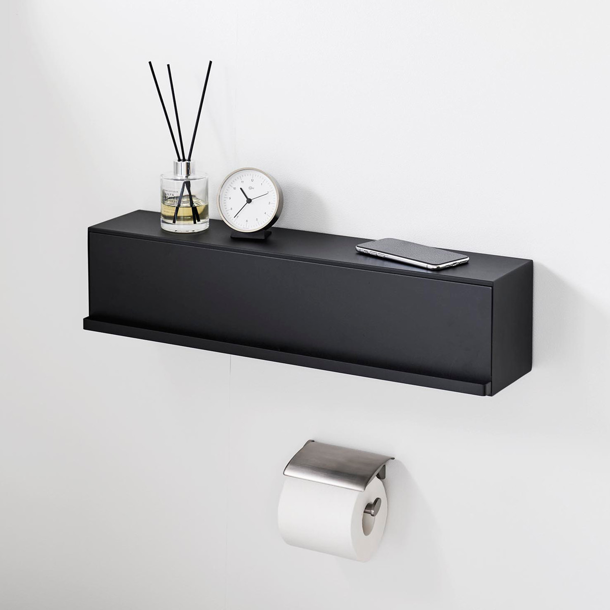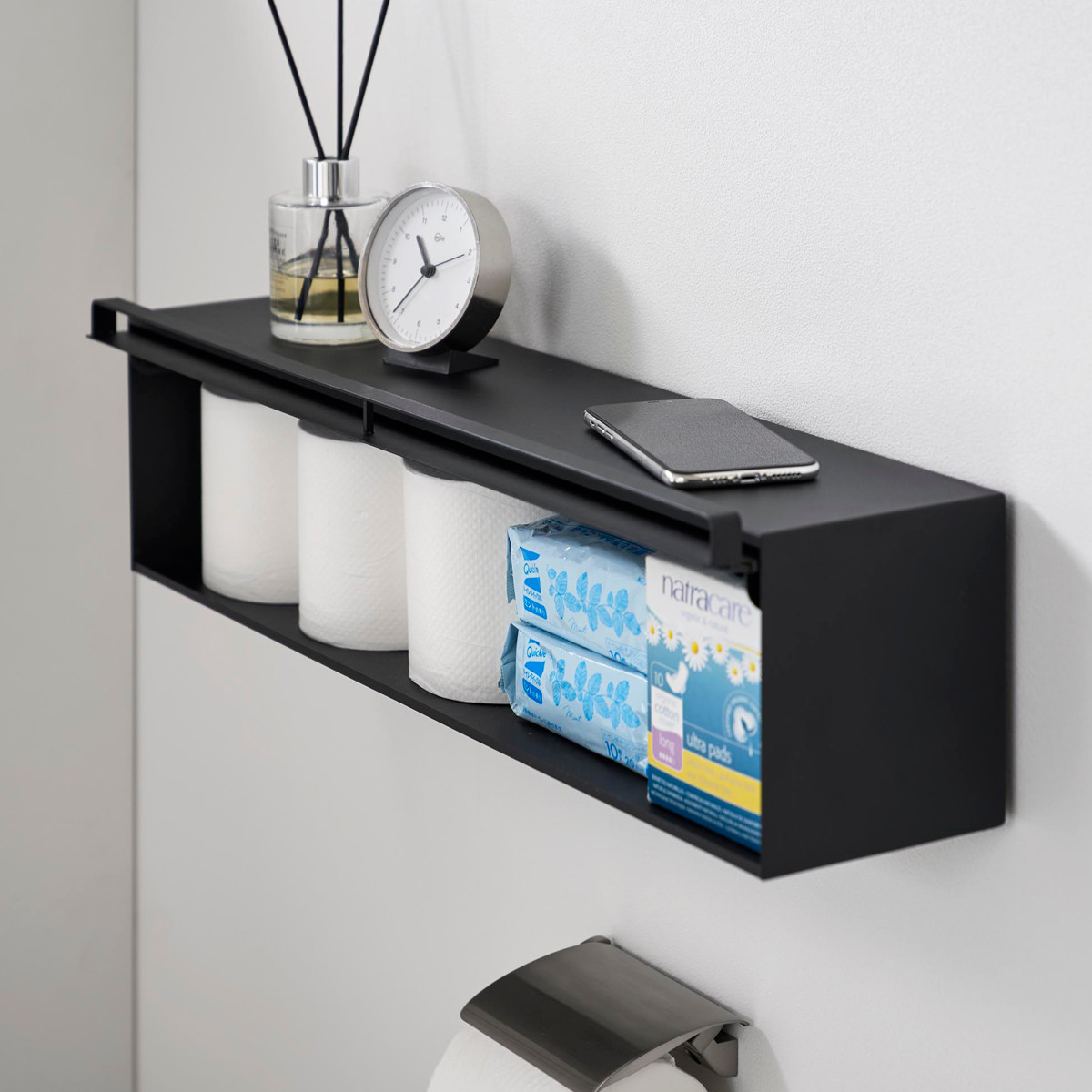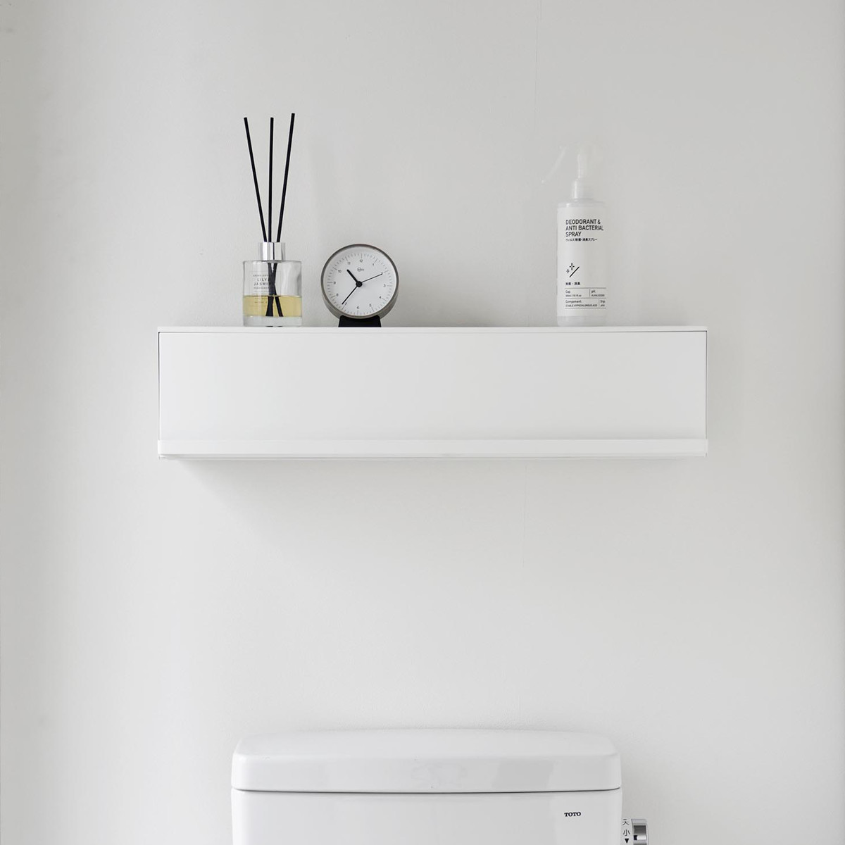 石こうボードピンで簡単に取り付け可能な壁面収納です。幅60cmのワイドサイズでたくさん収納できます。狭いトイレ空間も壁面を利用して収納することで使いやすく、スッキリ整います。