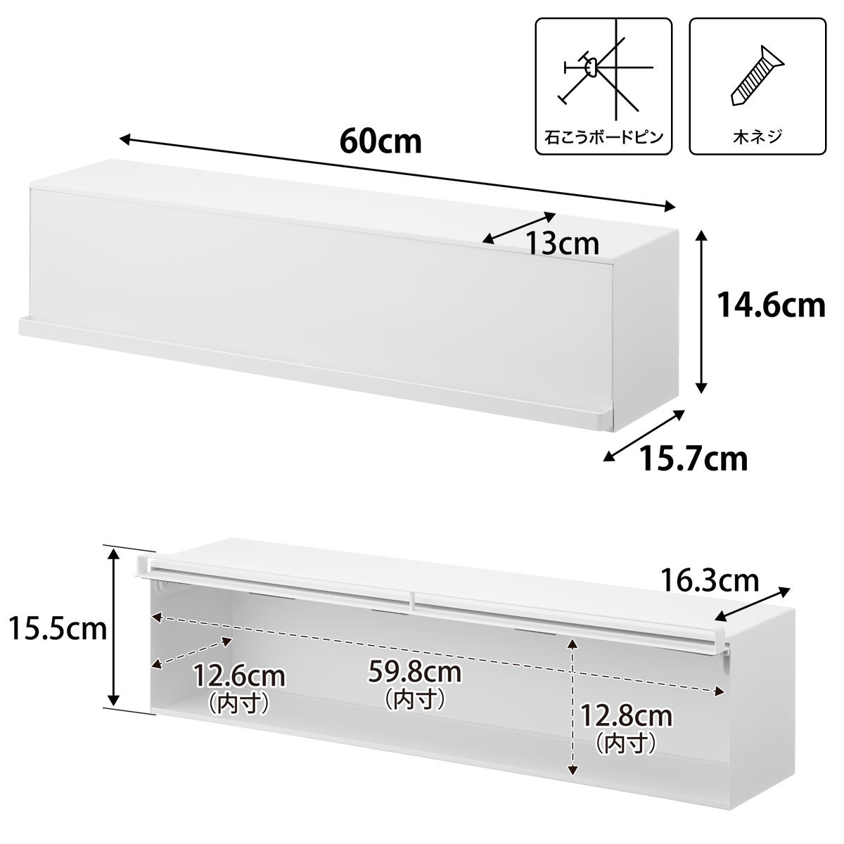 | サイズ | 約 幅60×奥行15.7×高さ14.6(cm) 扉開口時:約 奥行16.3×高さ15.5(cm) 天板内寸:約 幅60×奥行13(cm) 収納部内寸:約 幅59.8×奥行12.6×高さ12.8(cm)(有効内寸・ローラー部含まず) |