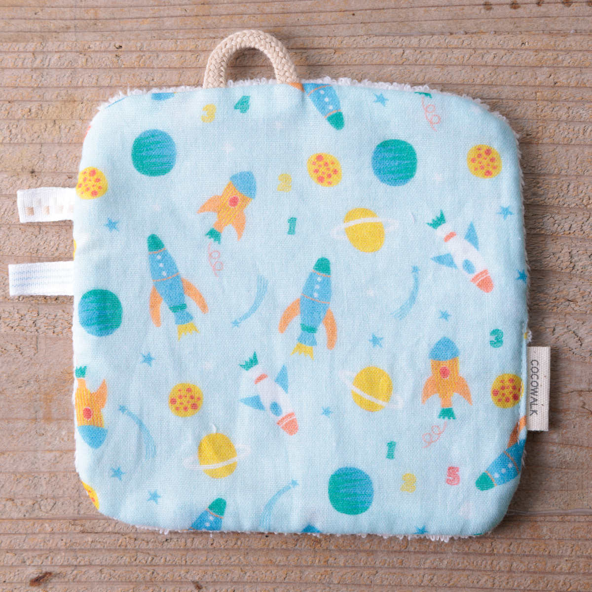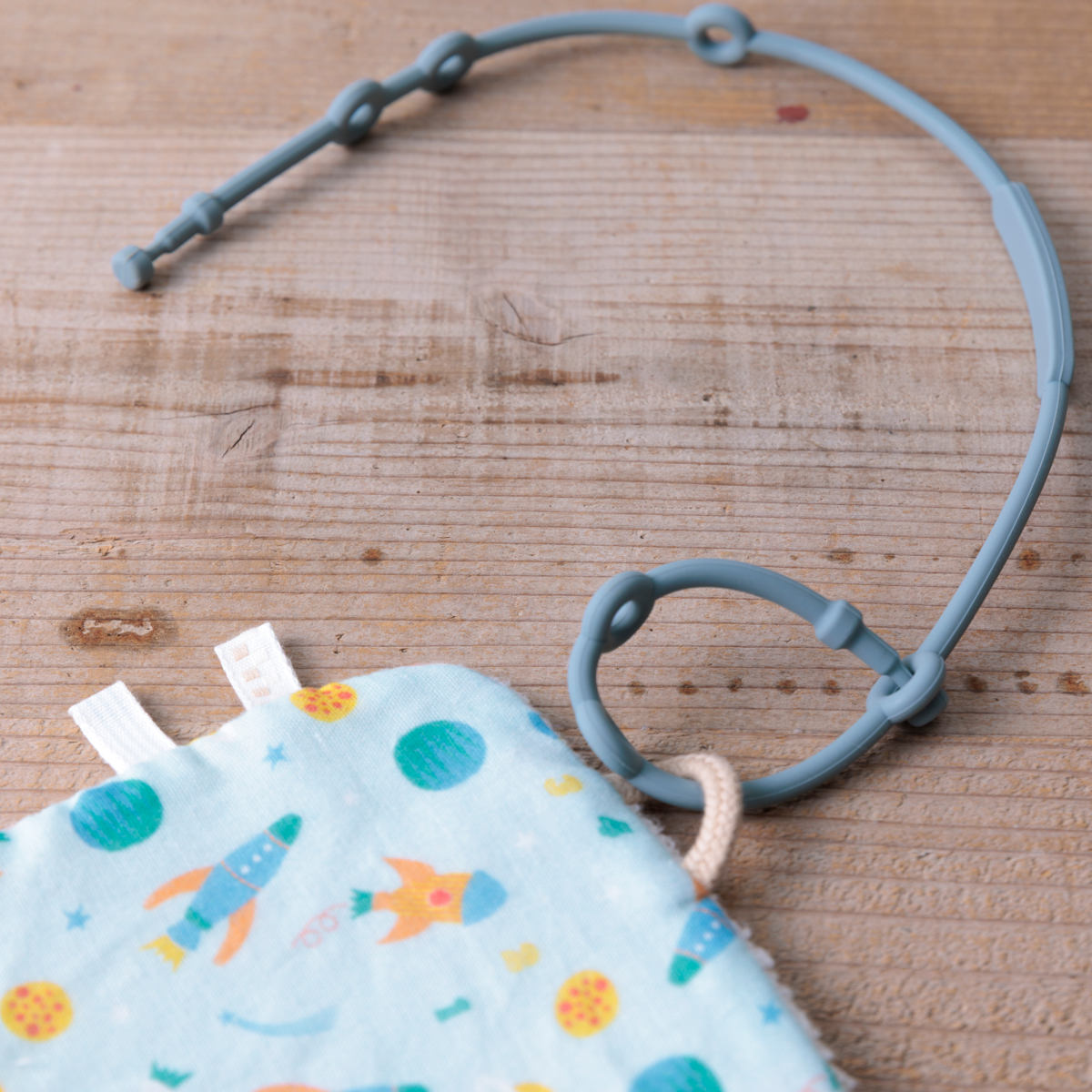 赤ちゃんの五感を刺激するのにぴったりのおもちゃハンカチです。中にフィルムが入っており、触るとカシャカシャ音がします。付属のシリコンストラップを付ければ、お出掛け時の持ち運びにも便利です。