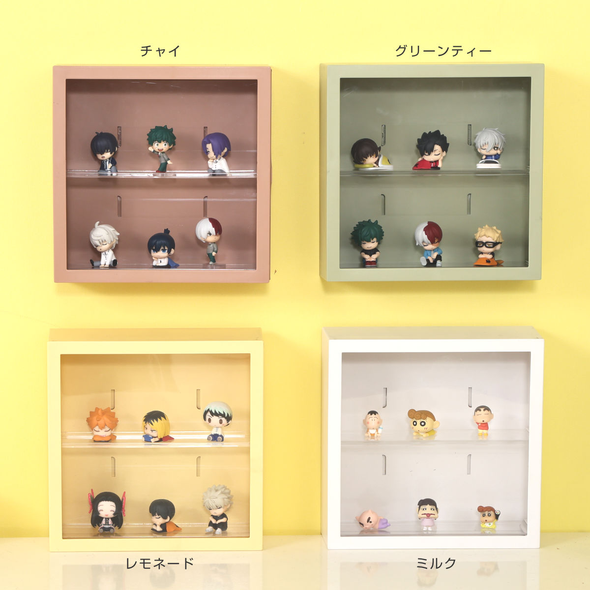 推しキャラクターやお部屋の雰囲気に合わせて「推し色」を選べるので、コレクションがより特別に映えます。複数の色を並べても可愛く、飾り方のアレンジも自由自在です。
