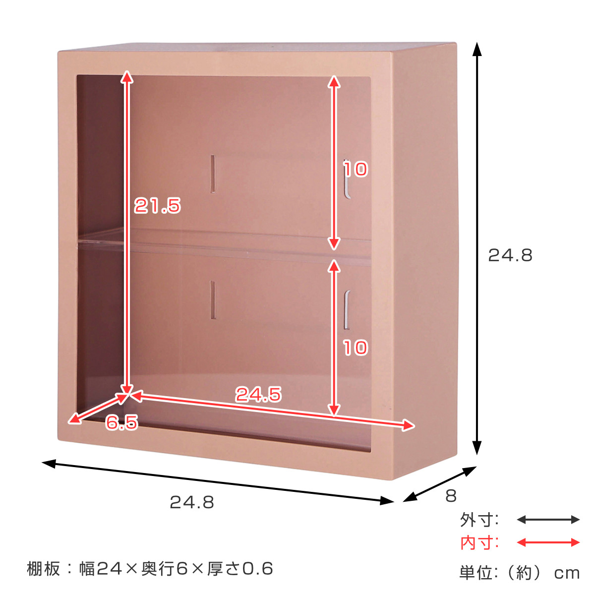 | サイズ | 外寸:約 幅24.8×奥行8×高さ24.8(cm) 内寸:約 幅24.5×奥行6.5×高さ21.5(cm) 棚板:約 幅24.5×奥行6×厚さ0.6(cm) |