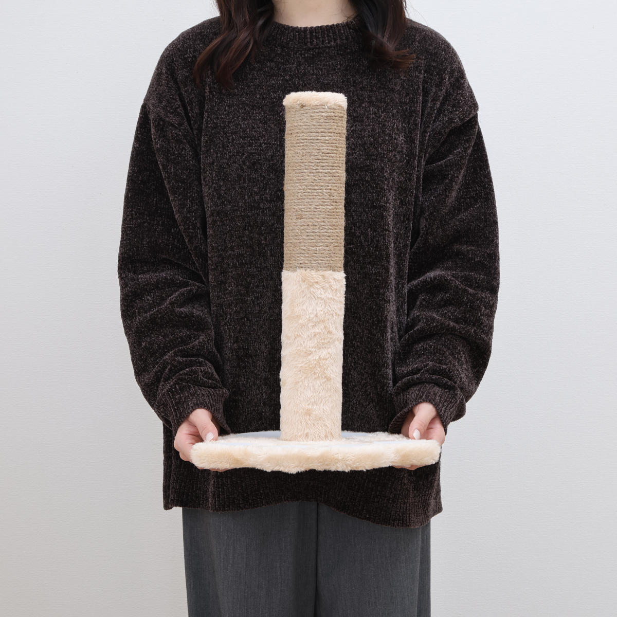 土台のかわいらしい肉球が目を引くキュートなデザインの爪とぎです。グレーとベージュの2色展開で、どちらも落ち着いたカラーリングのためお部屋に馴染みやすく、リビングや人目につくとろこにも置きやすいです。