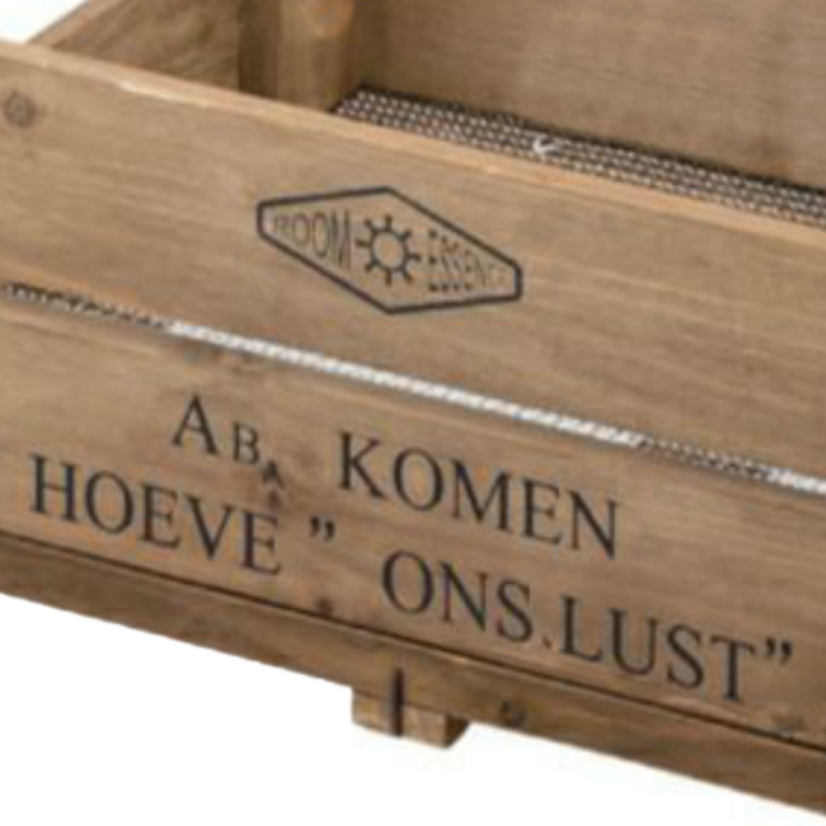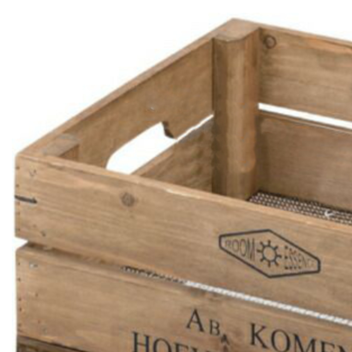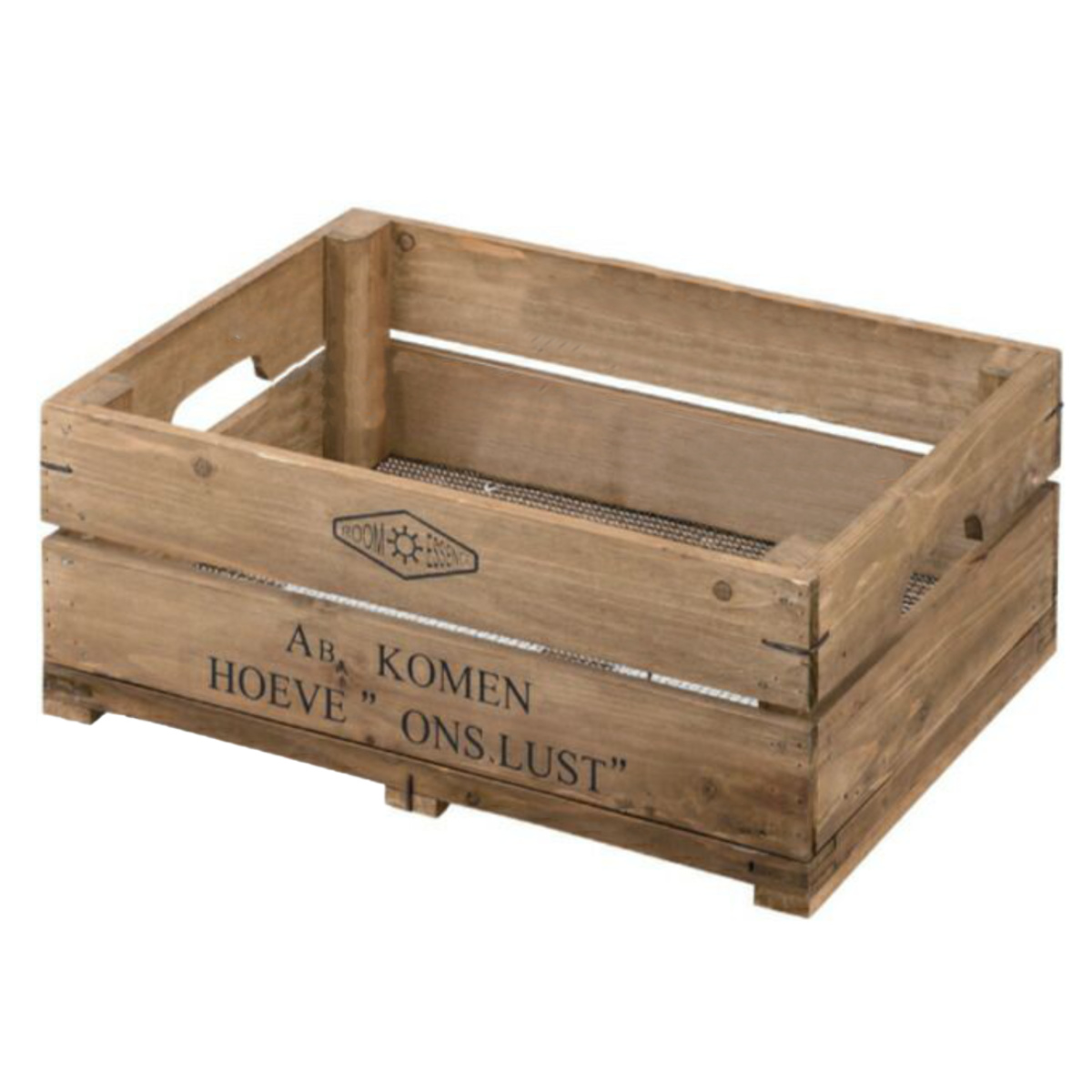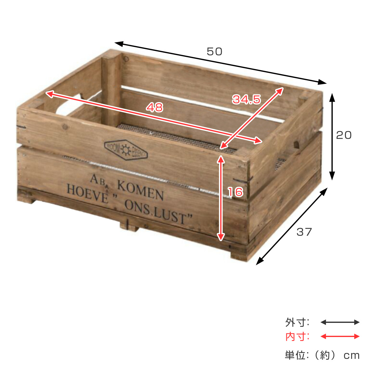 側面に施された英字のステンシル風プリントが、海外の農園や市場で使われていた木箱のような雰囲気を演出します。