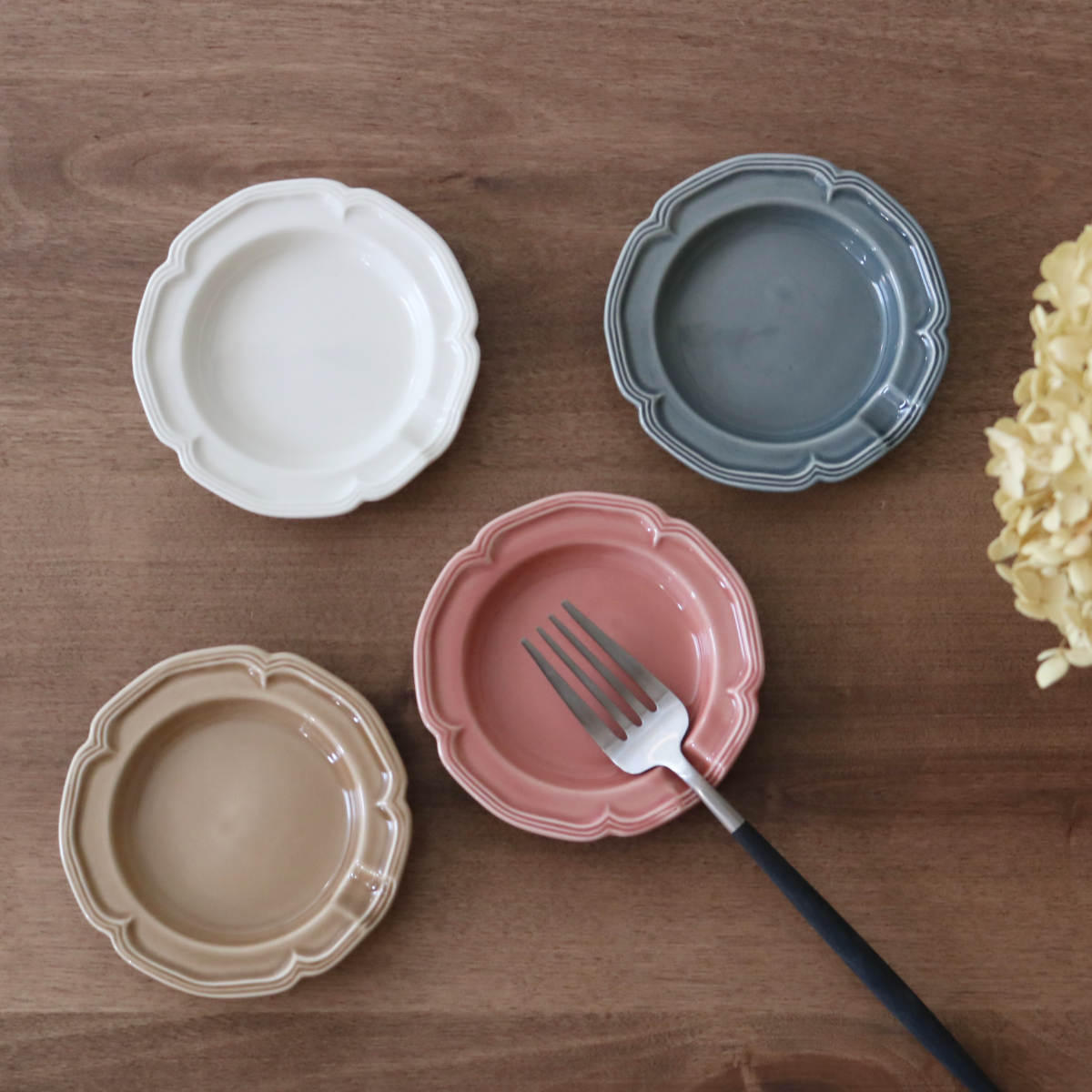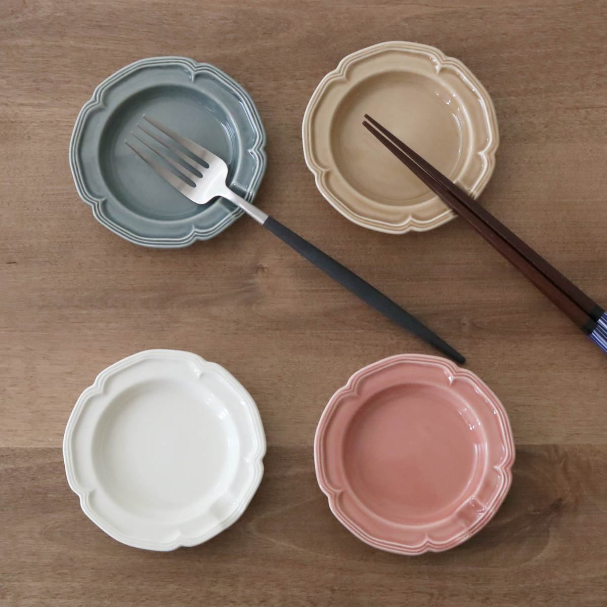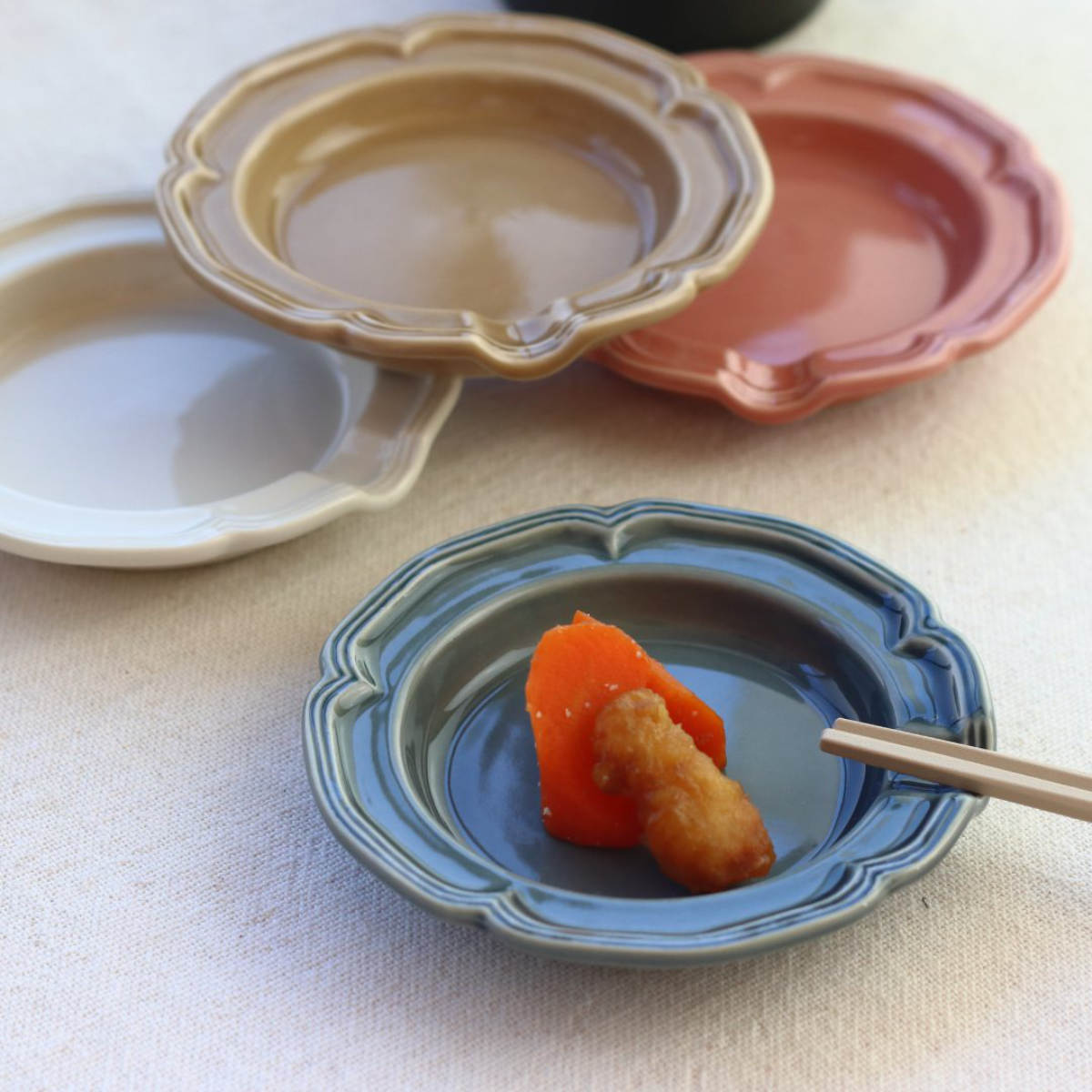 花の形をモチーフにした、やわらかで華やかなデザインが魅力。テーブルに並べるだけで、食卓がパッと明るく、かわいらしい雰囲気になります。日本有数の陶磁器の産地・愛知県瀬戸市で作られた日本製の器です。