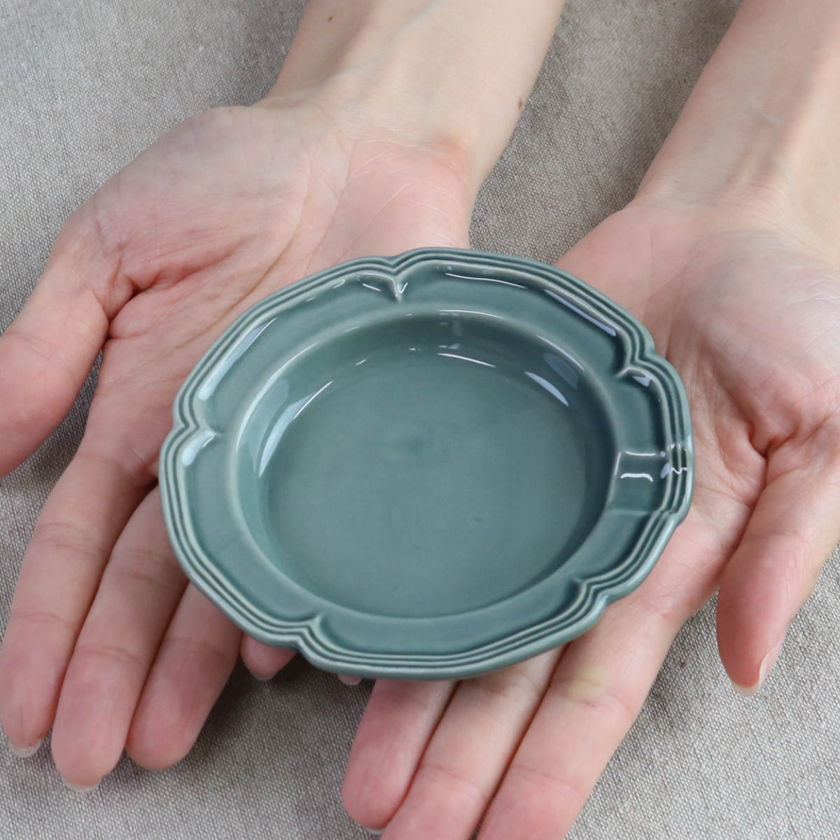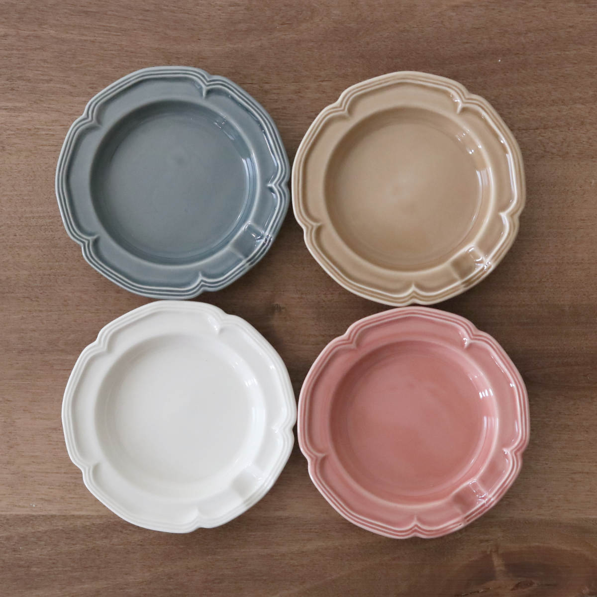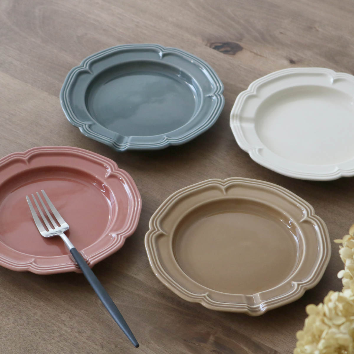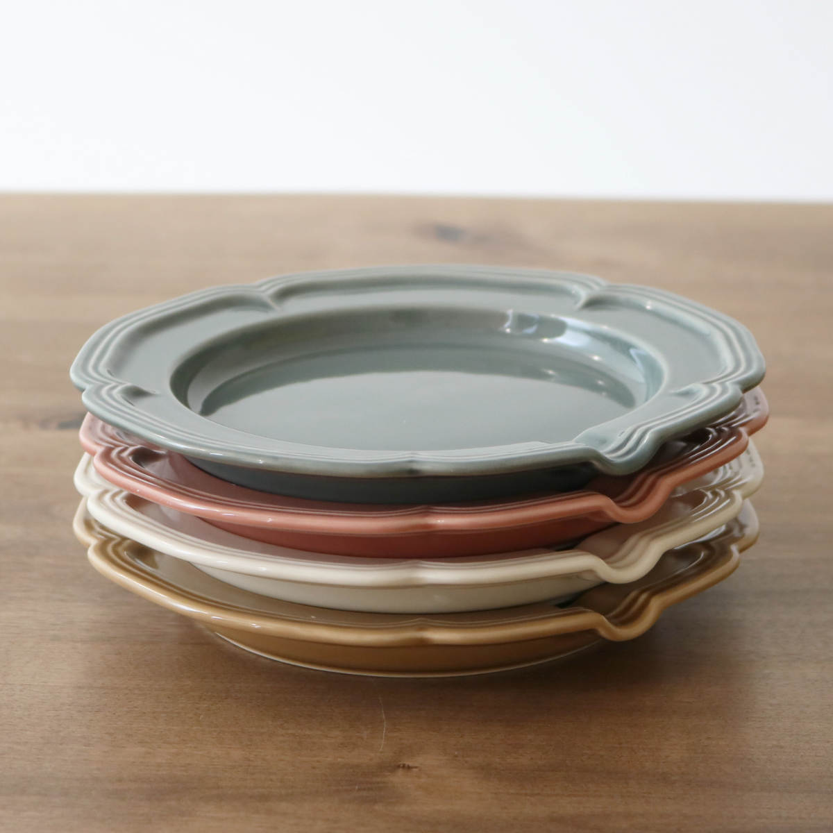 花の形をモチーフにした、やわらかで華やかなデザインが魅力。テーブルに並べるだけで、食卓がパッと明るく、かわいらしい雰囲気になります。日本有数の陶磁器の産地・愛知県瀬戸市で作られた日本製の器です。
