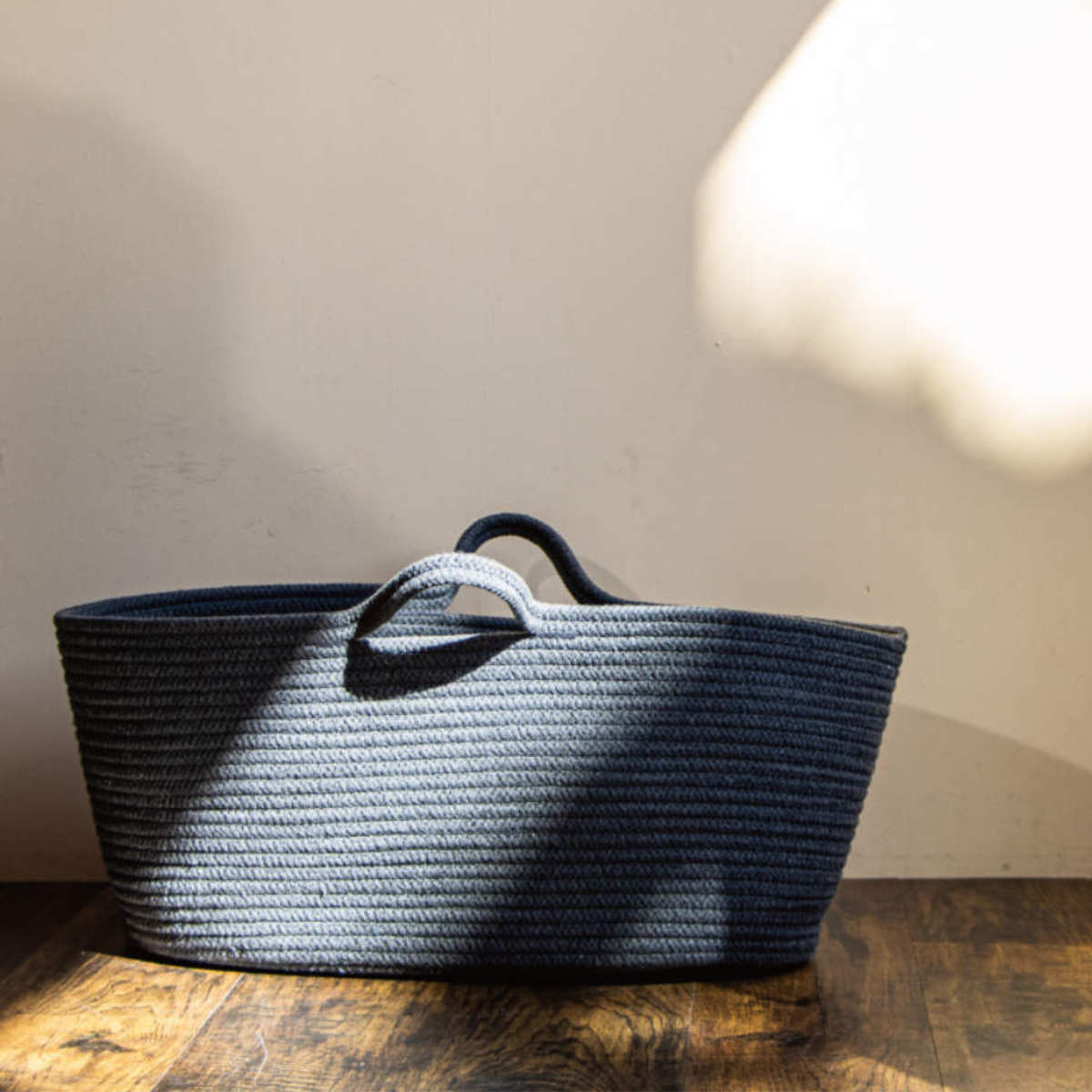 一本のコットンロープを、縫い留めて強度を高めたロープバスケットは、自立するしっかりとした素材感です。