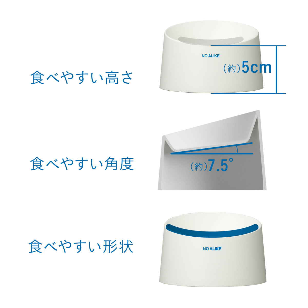 顔を入れやすく、自然な姿勢で食べやすい設計です。前面の高さは約5cmと程よく、首を大きくかがめる必要がありません。内側には適度な傾斜がついており、ペットの体に負担をかけにくい形状です。