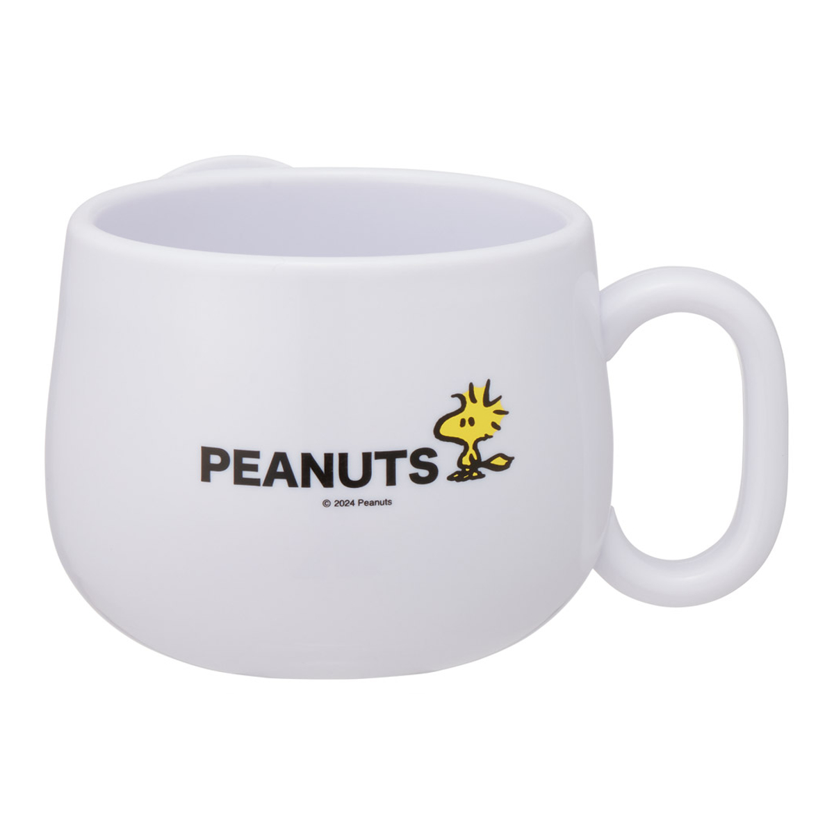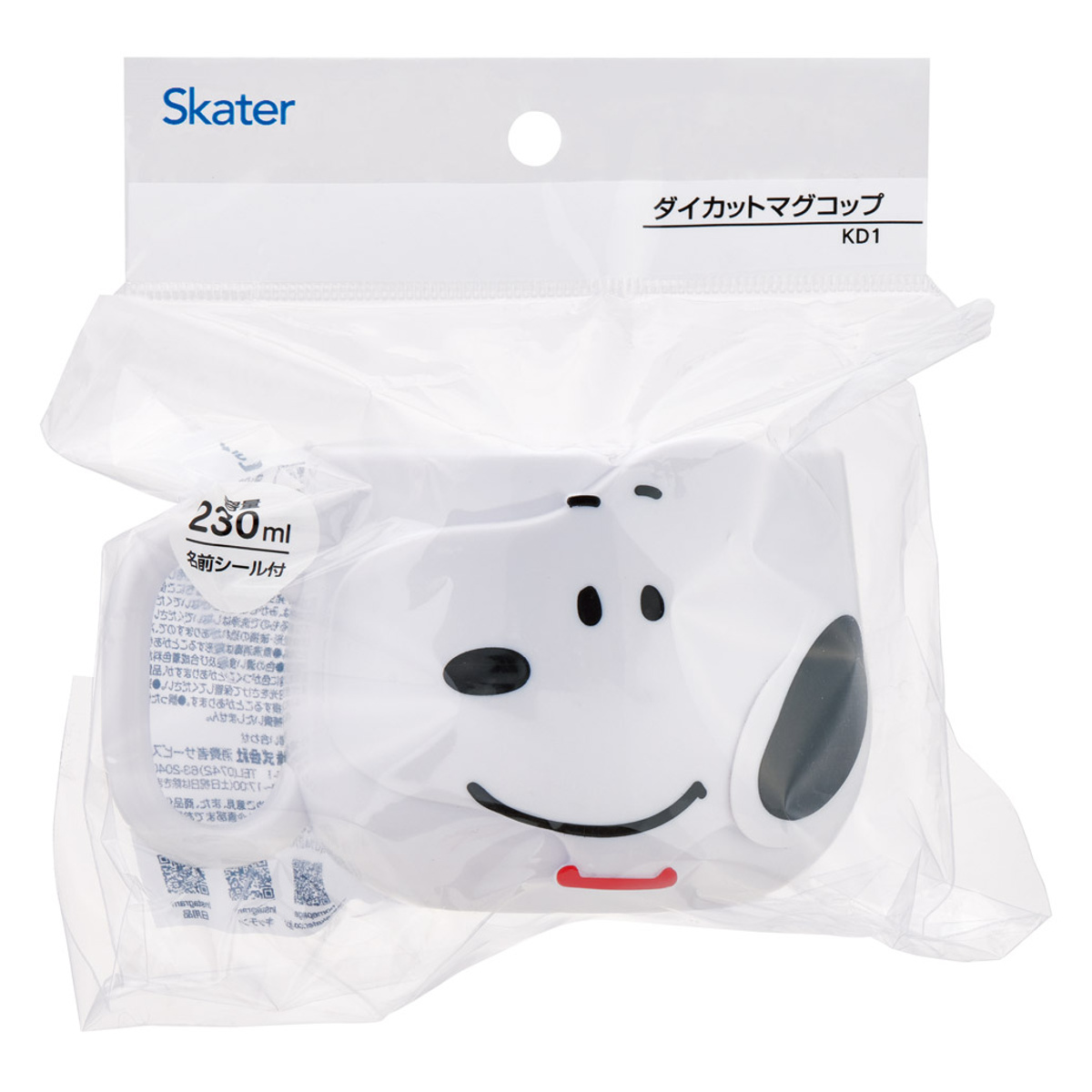 スヌーピーの立体的な顔が可愛いマグカップです。プラスチック製なので落としても割れにくく、小さなお子様でも安心してお使いいただけます。一回のお食事にちょうどいい容量230mlです。お名前シール付きなので、通園用としても最適です。