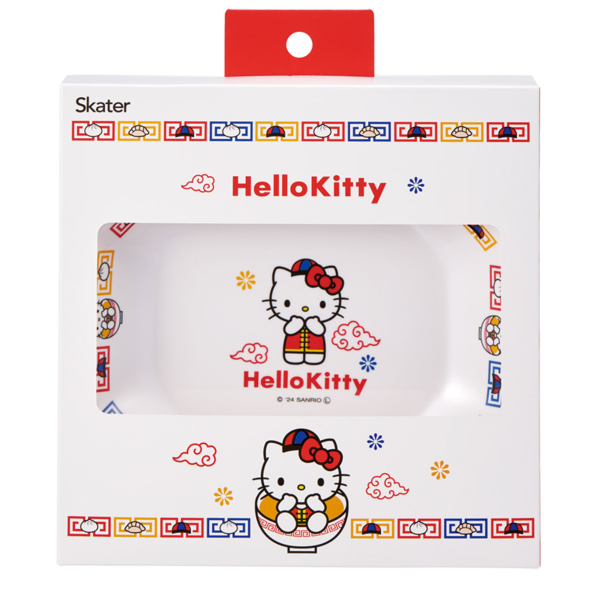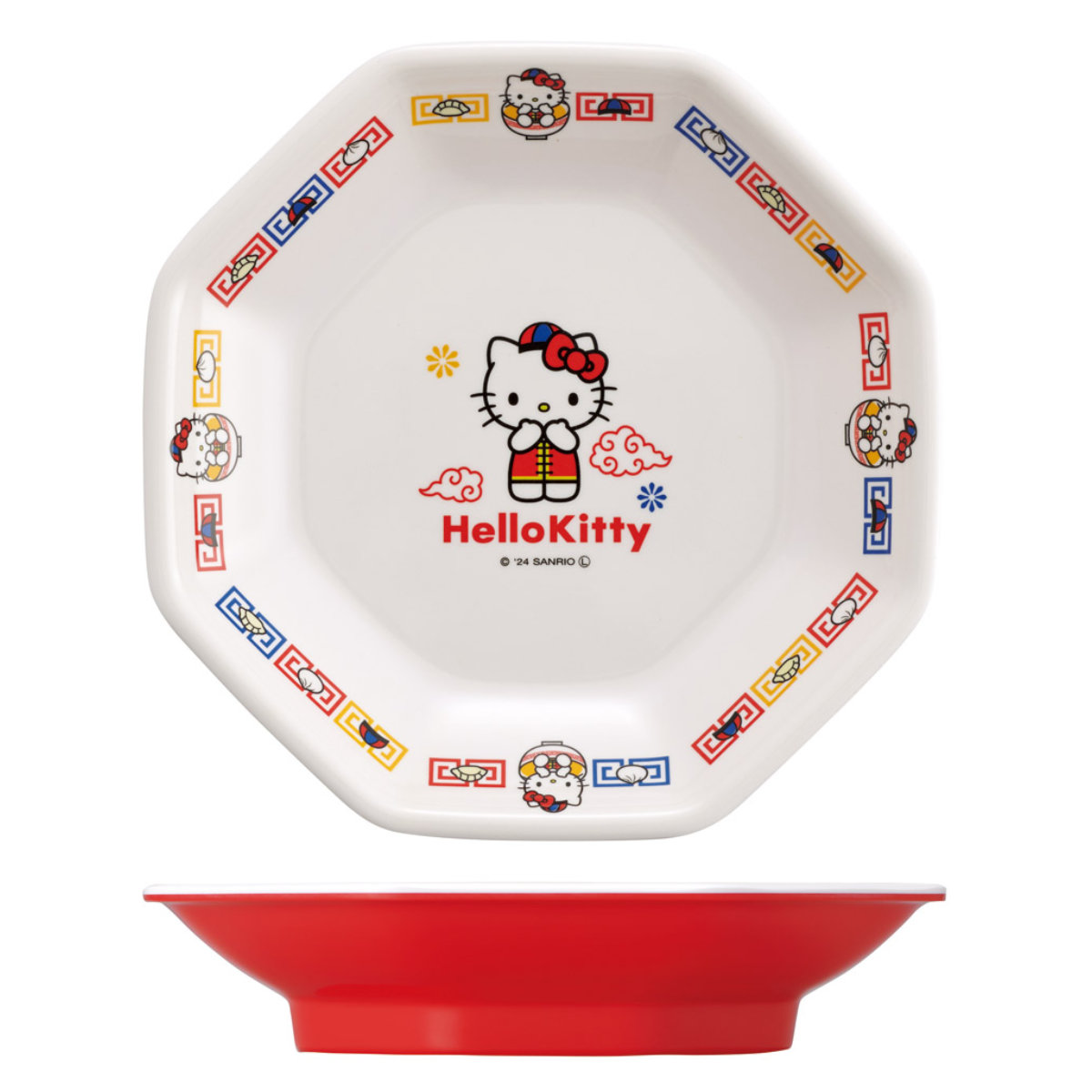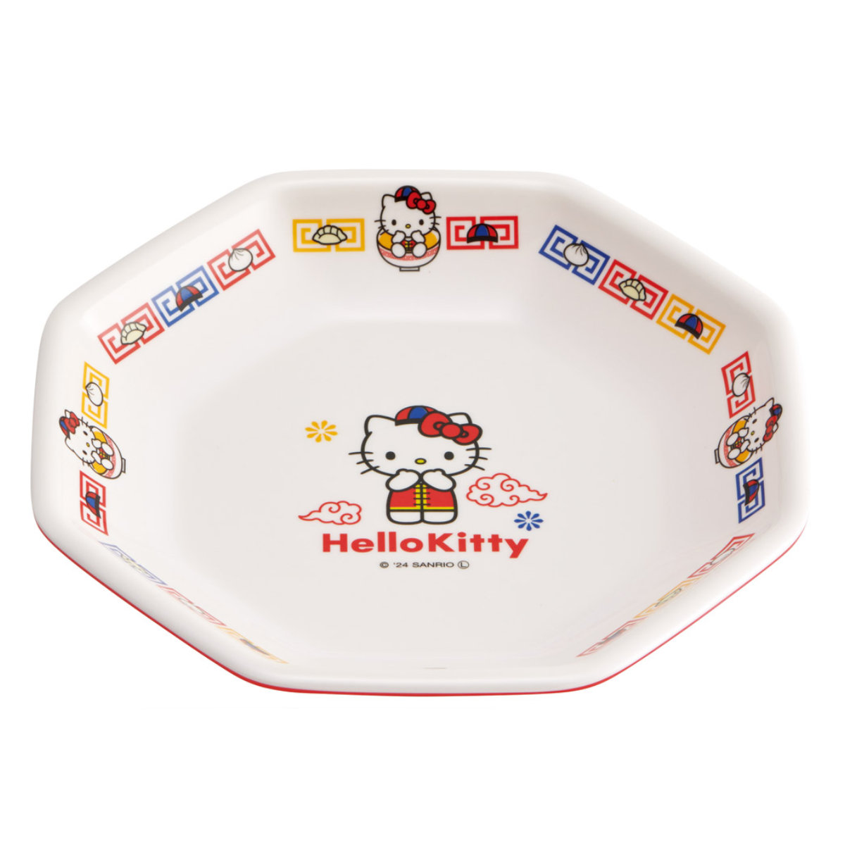 ハローキティデザインのチャーハン皿です。フチ部分には、明るく華やかな中華風デザインがあしらわれており、料理をより美味しそうに引き立てます。