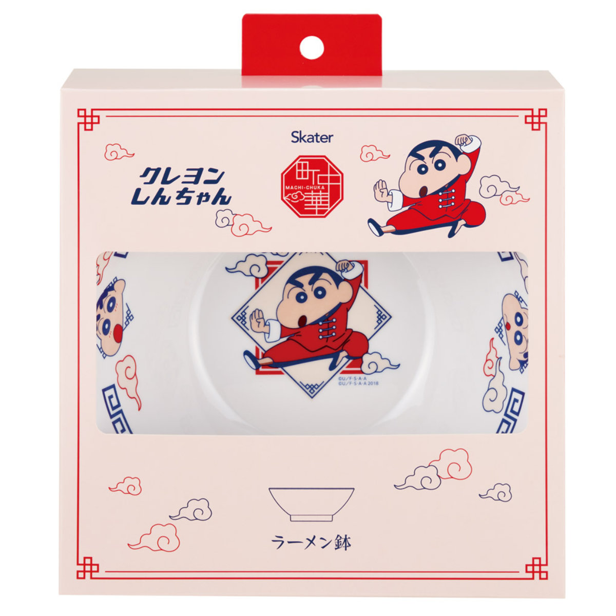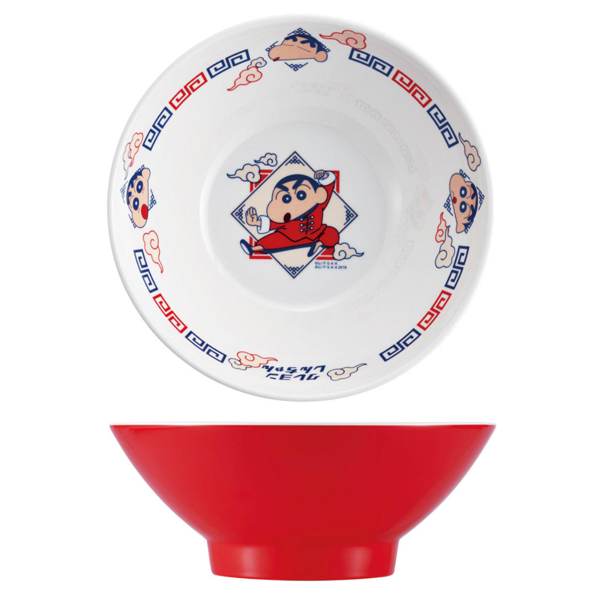 クレヨンしんちゃんデザインのラーメン鉢です。深さのある形状なので、スープやタレと麺をしっかり楽しめます。フチ部分には、明るく華やかな中華風デザインがあしらわれており、料理をより美味しそうに引き立てます。