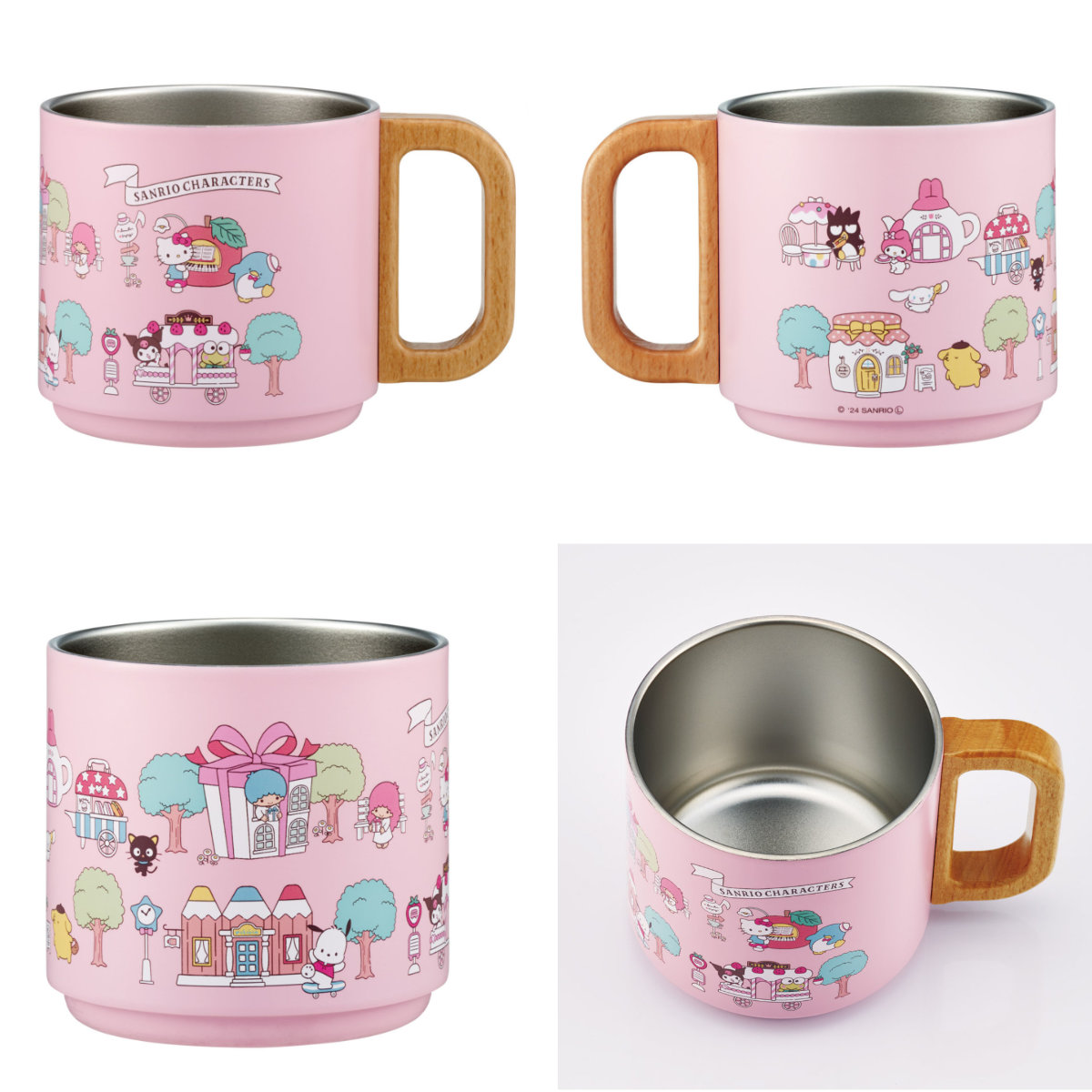 コーヒーや紅茶はもちろん、スープやジュースなど、さまざまな用途に活躍します。飲みきりやすく、持ち運びにも便利なサイズ感で、毎日のドリンクタイムをより快適にしてくれます。天然木ハンドルのやさしい持ち心地も魅力です。サンリオの人気キャラクターたちが、仲良く村で暮らしている様子が描かれた、癒しのデザインです。