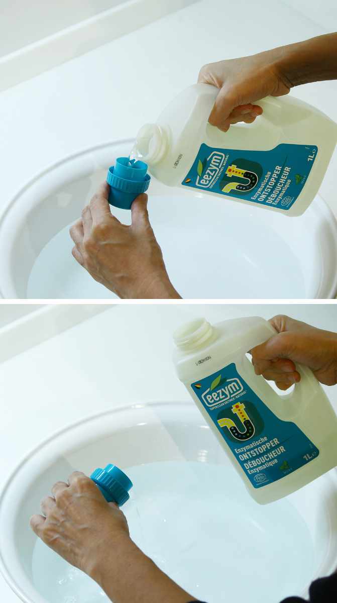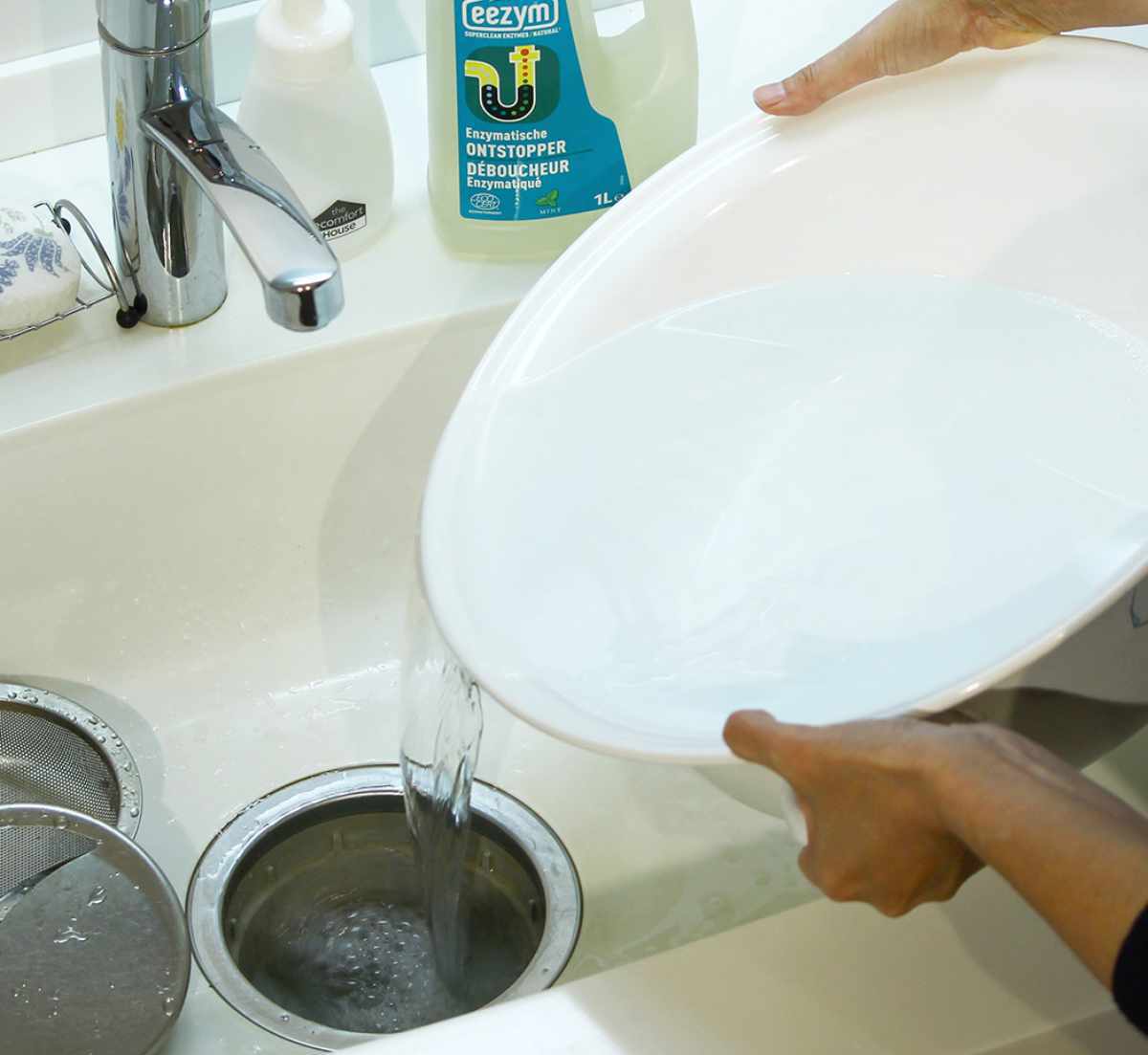 酵素は放置することで汚れをどんどん分解し、サラッと汚れが取れます。キャップ5杯分の洗剤をぬるま湯に入れ、排水溝に注いで約6~7時間で詰まりが解消します。