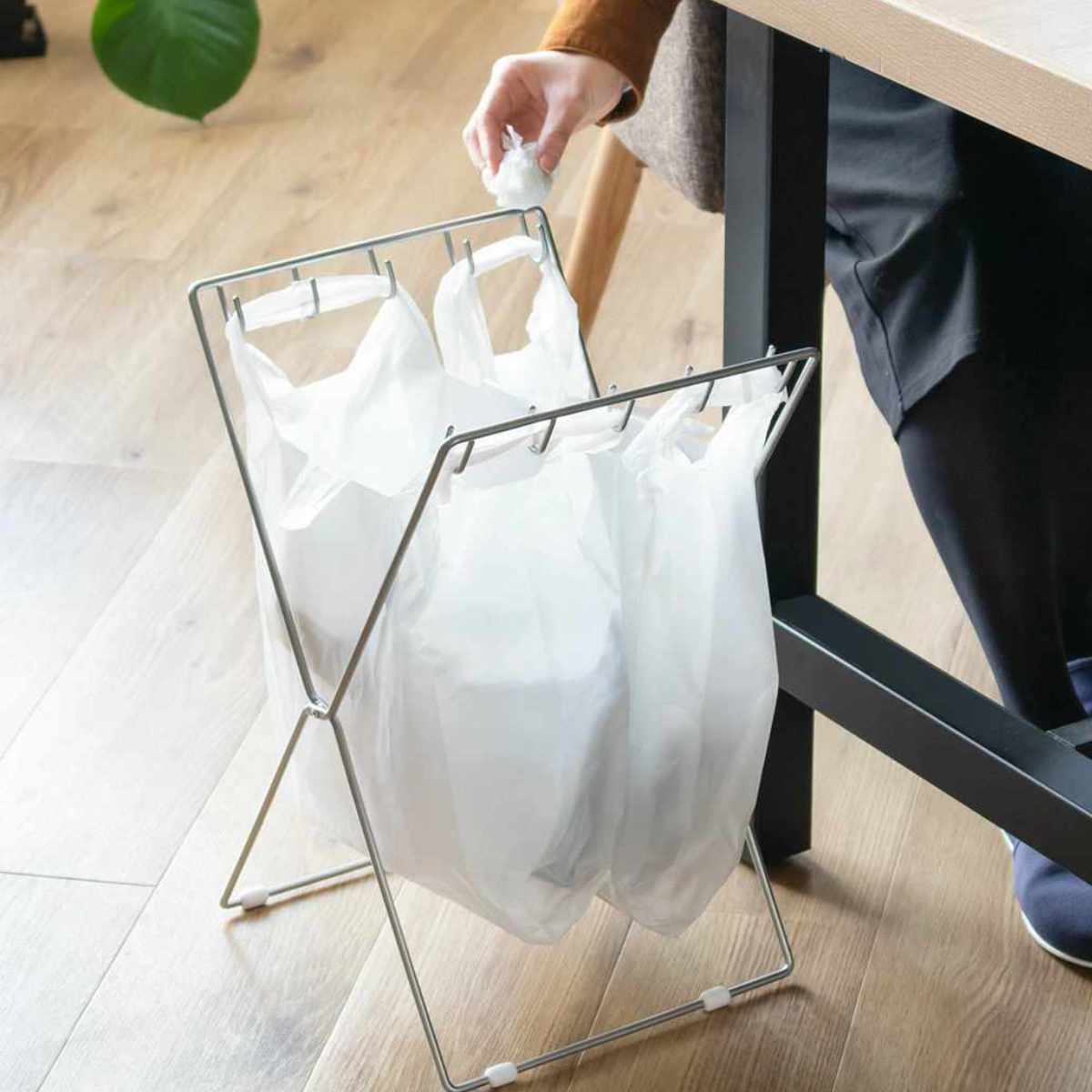 ゴミ袋を引っ掛けるだけで便利に使えるレジ袋スタンド