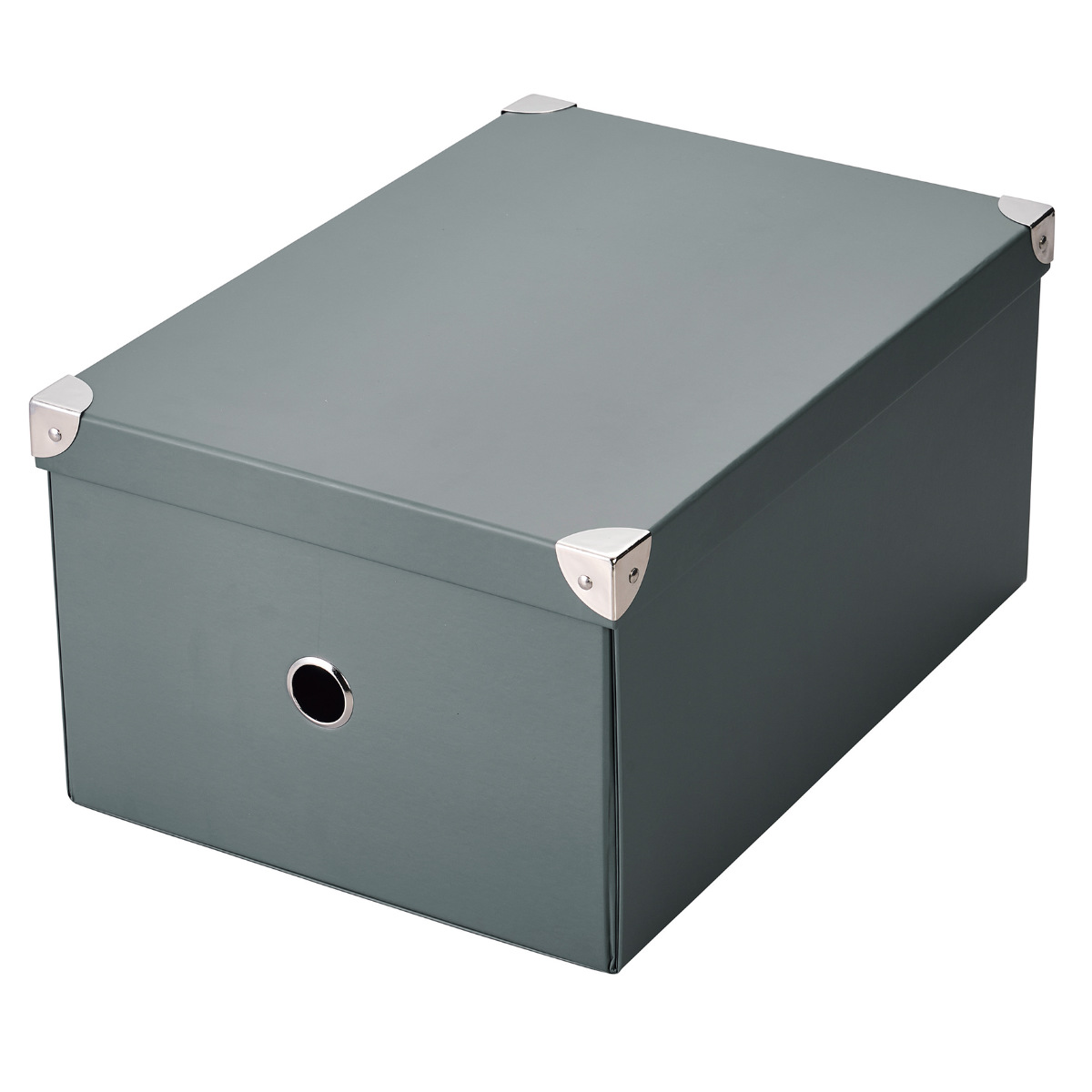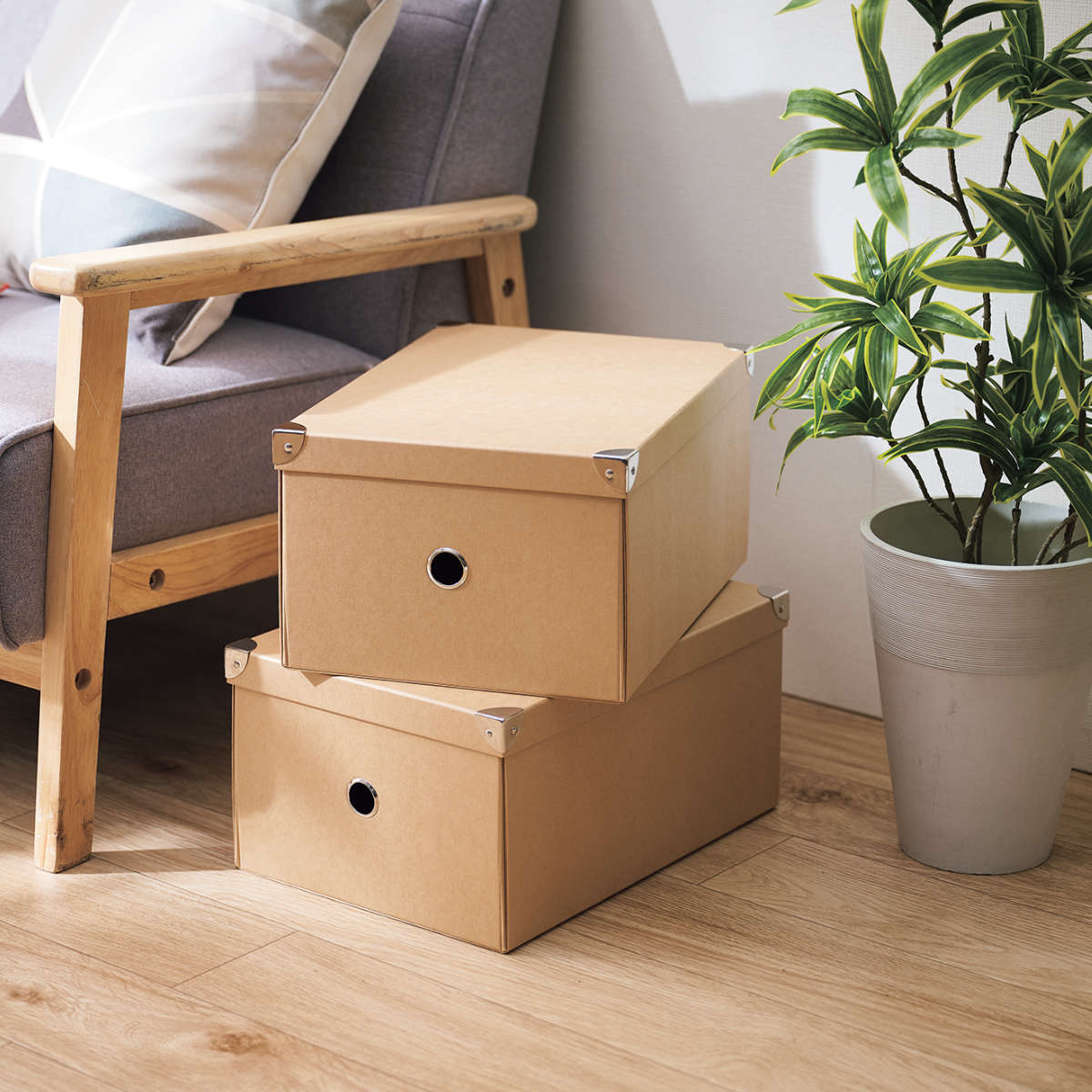 パルプ素材を使用した収納ボックスです。フタ付きでホコリを防ぎ、組み立ても簡単です。