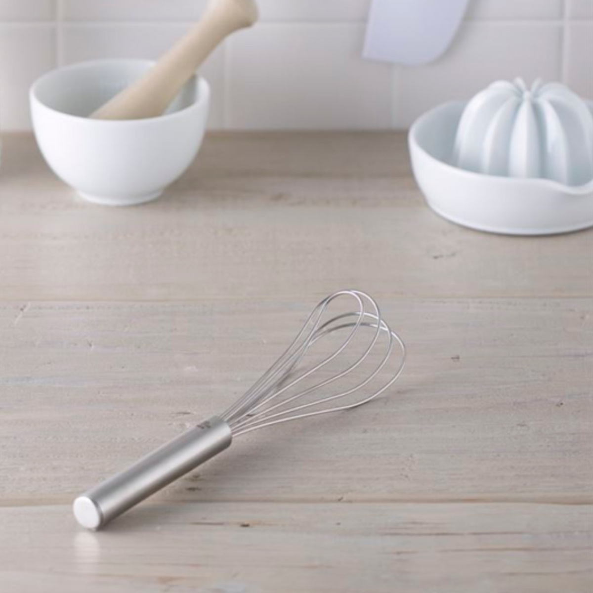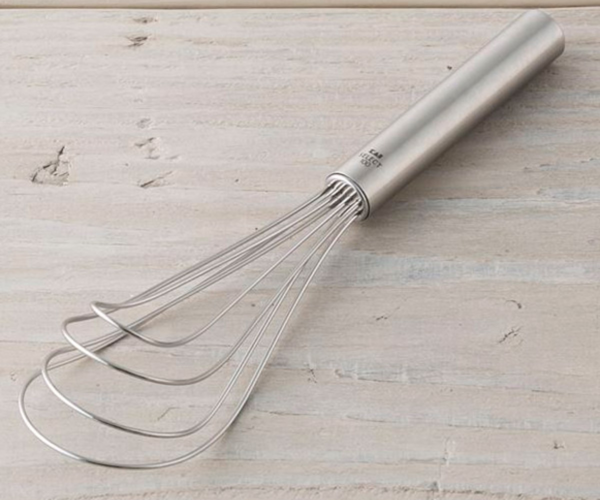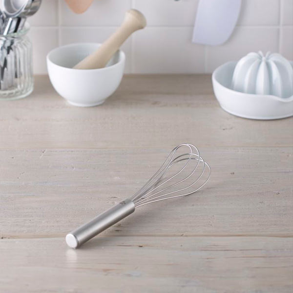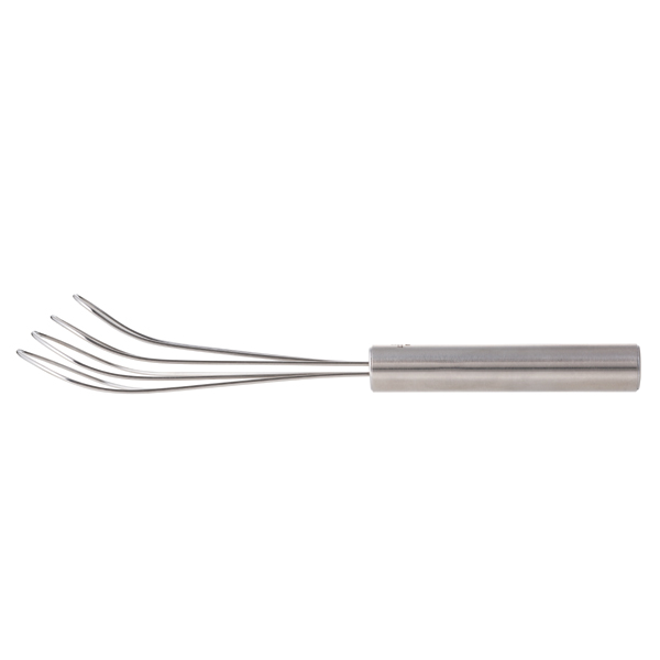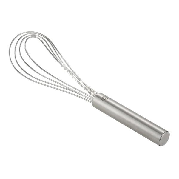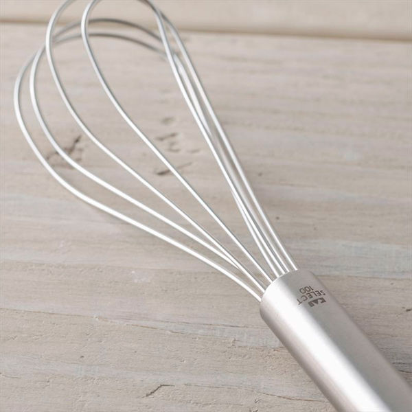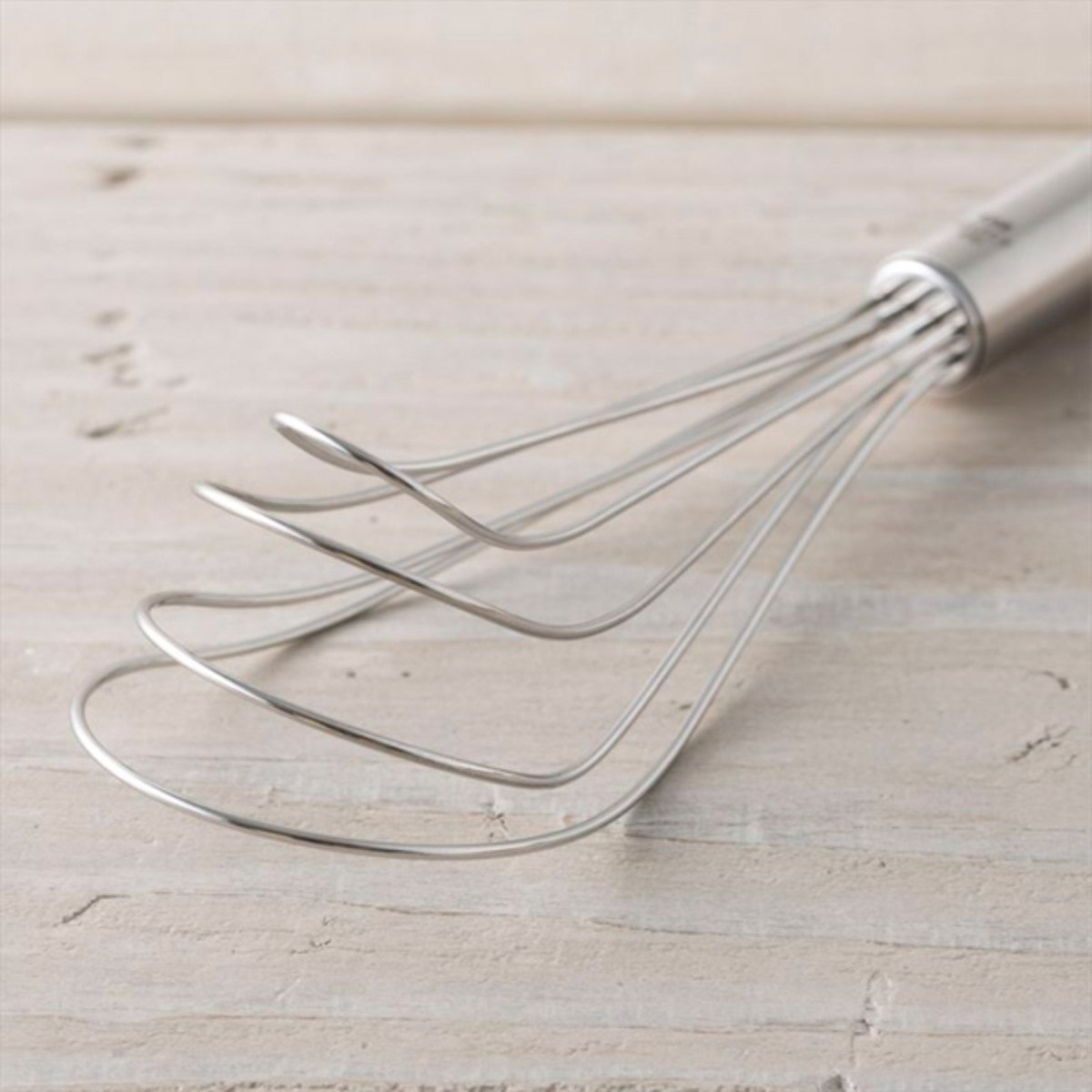 フラットワイヤー形状のウィスクです。4本のワイヤーが立体的に配置されているため、先端が鍋やフライパンに沿いやすいので、ホワイトソースなど粘度のあるものを、こそぎながら混ぜるのに便利です。
