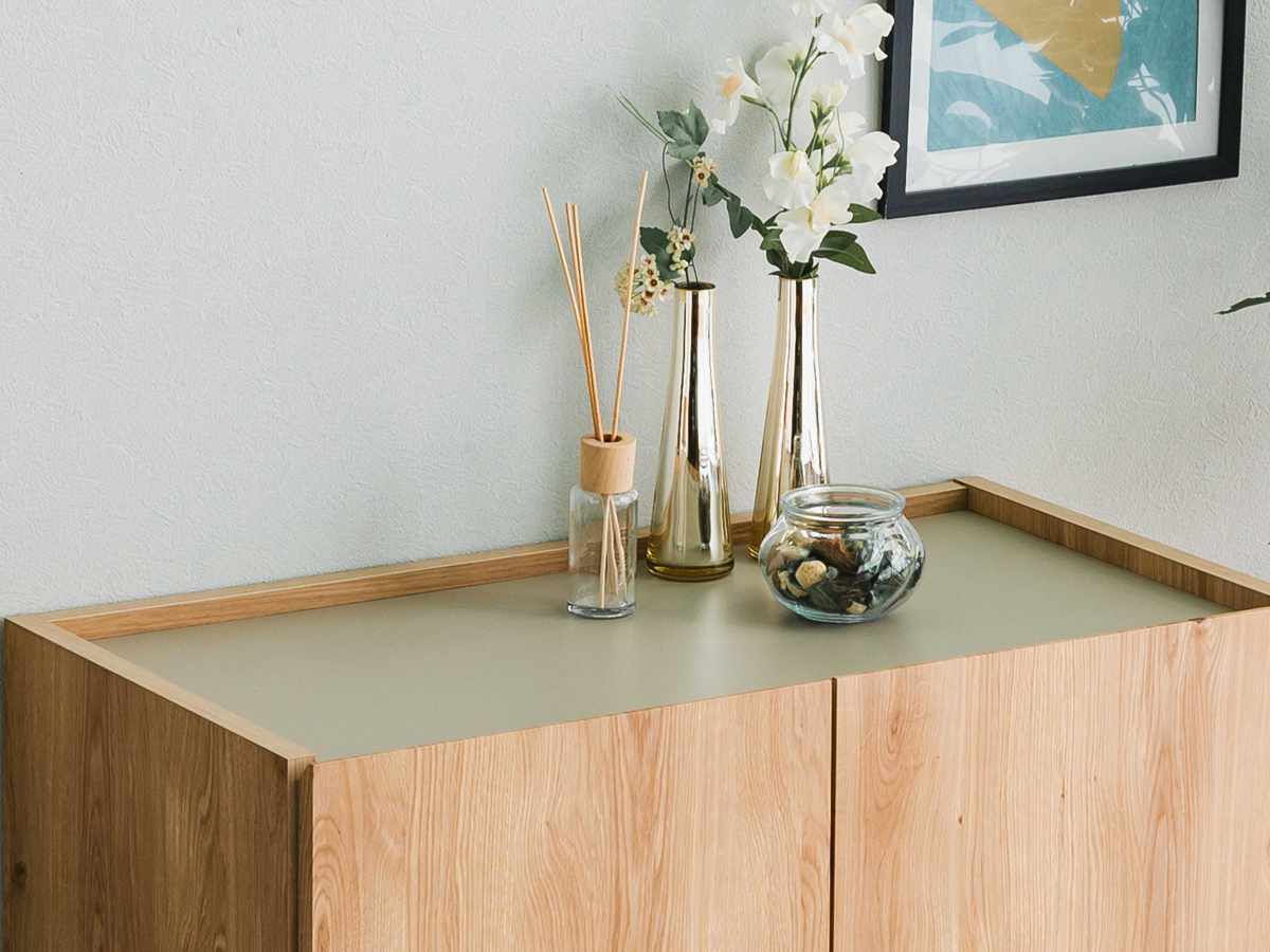 天板の上にはお気に入りの雑貨や小物類をディスプレイしていただけます。フチに段差を付けた転び止め仕様なので、小物などの落下を防ぎます。