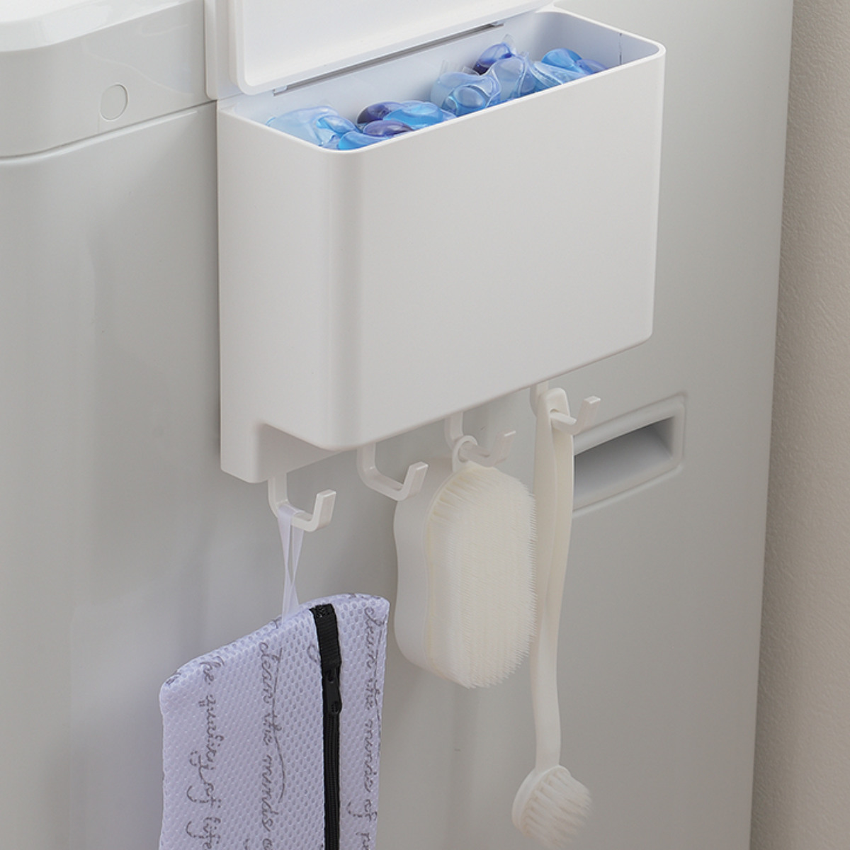 本体には便利なミニフック4つが付いており、ブラシや小物などのランドリー用品を掛けてスッキリ収納できます。フックはお好みの位置に調整可能なので、収納するアイテムや設置場所に合わせてお使いいただけます。