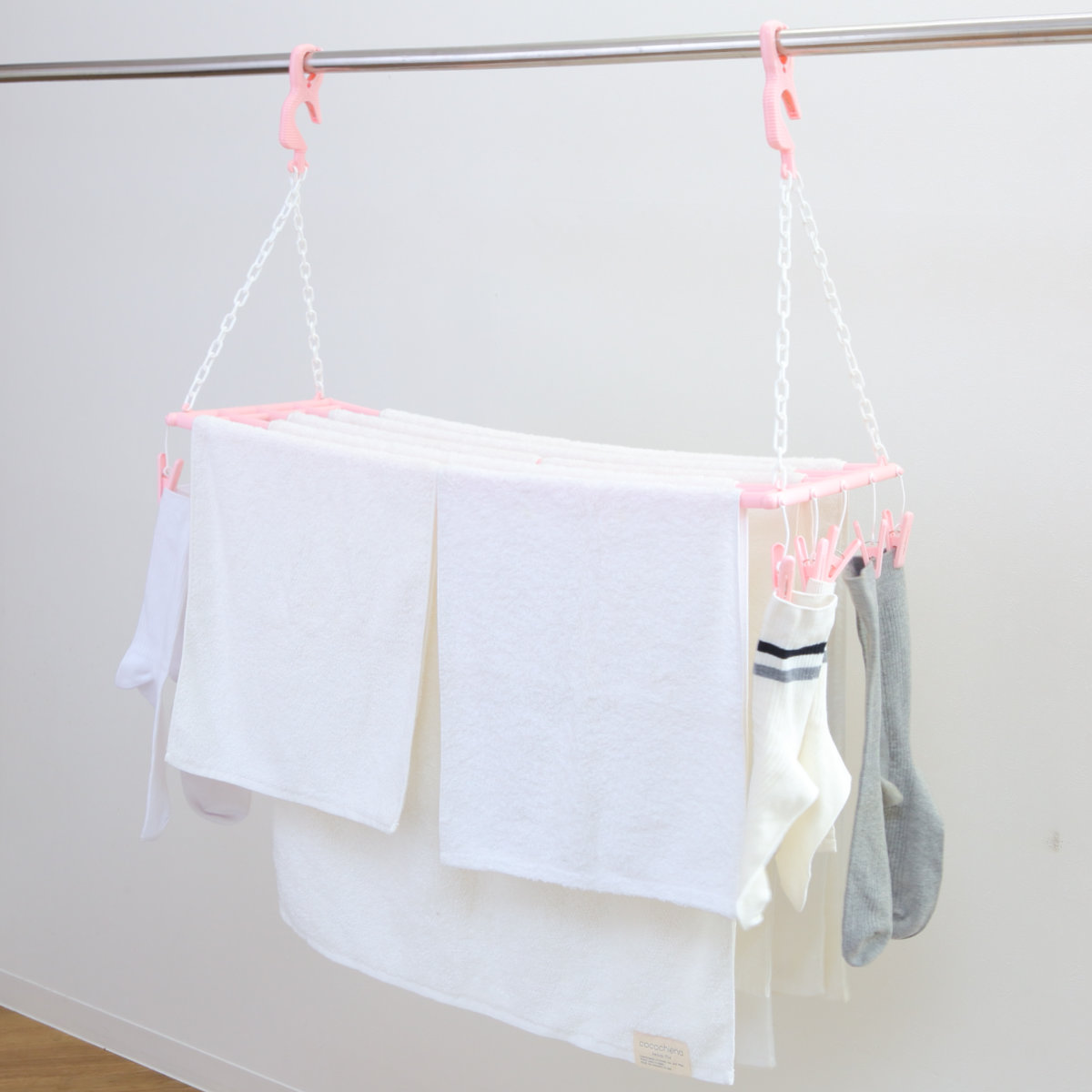 物干し竿に固定できるキャッチ式です。キャッチ式のフックでしっかり固定出来るので、屋外で干す時も風で飛ばされる心配がありません。