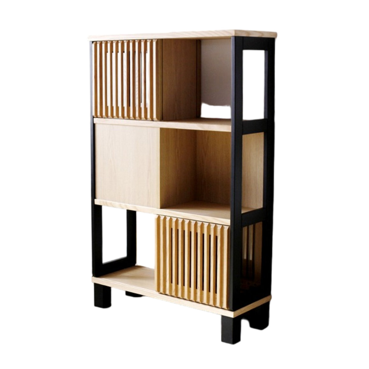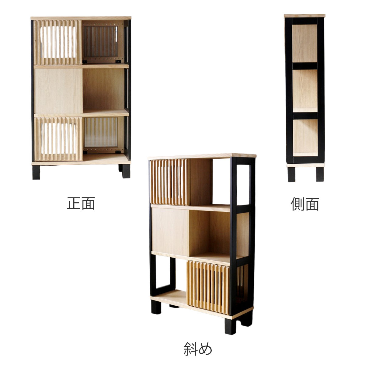 環境に配慮したFSC認証を取得した天然木工芸突板を使用したシェルフです。引き戸のルーバーデザインが圧迫感を軽減し、お部屋を優しい雰囲気にコーディネートしてくれます。お気に入りの小物を飾りながら、見せる収納と隠す収納、どちらもお楽しみいただけます。