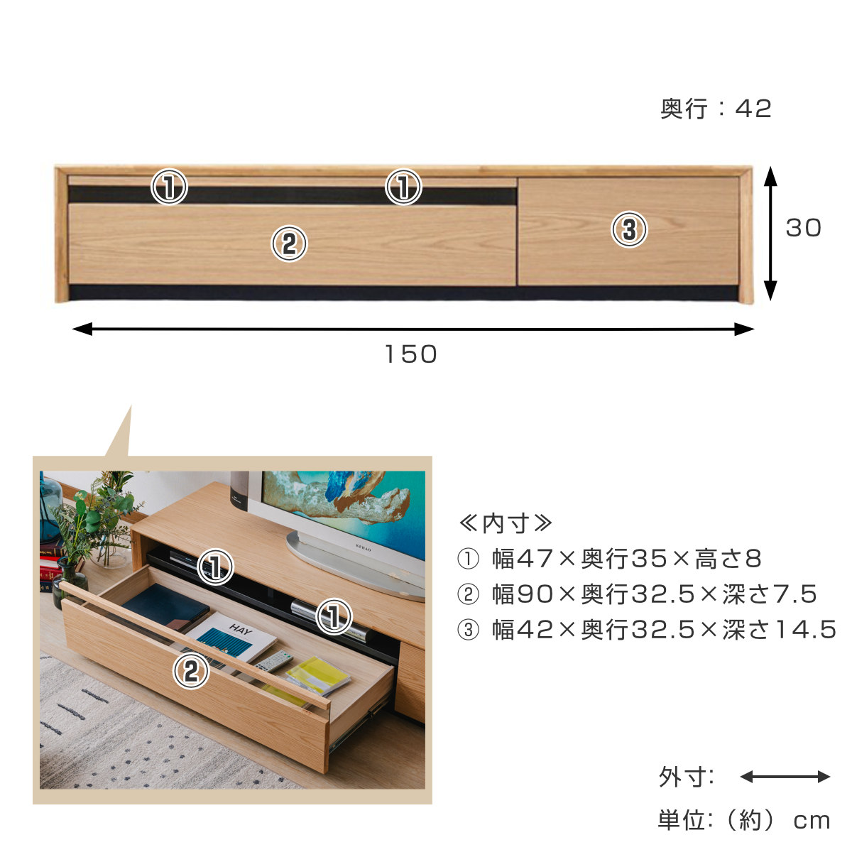 | サイズ | 約 幅150×奥行42×高さ30(cm) |