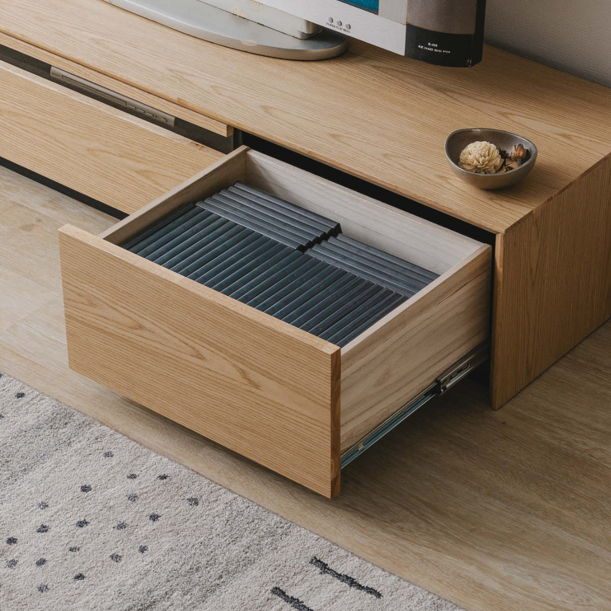 リビング周りの小物やDVDケースの収納に最適な引出しは、ダブルスライドレール仕様で奥までしっかりと見渡せます。DVDなどをたっぷり収納しても、スムーズに開閉ができます。