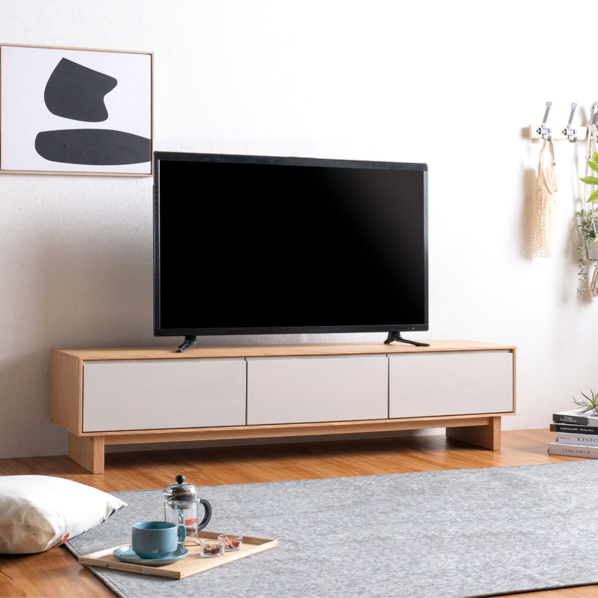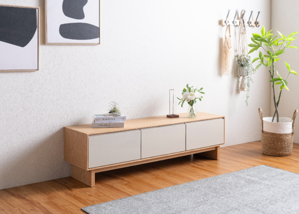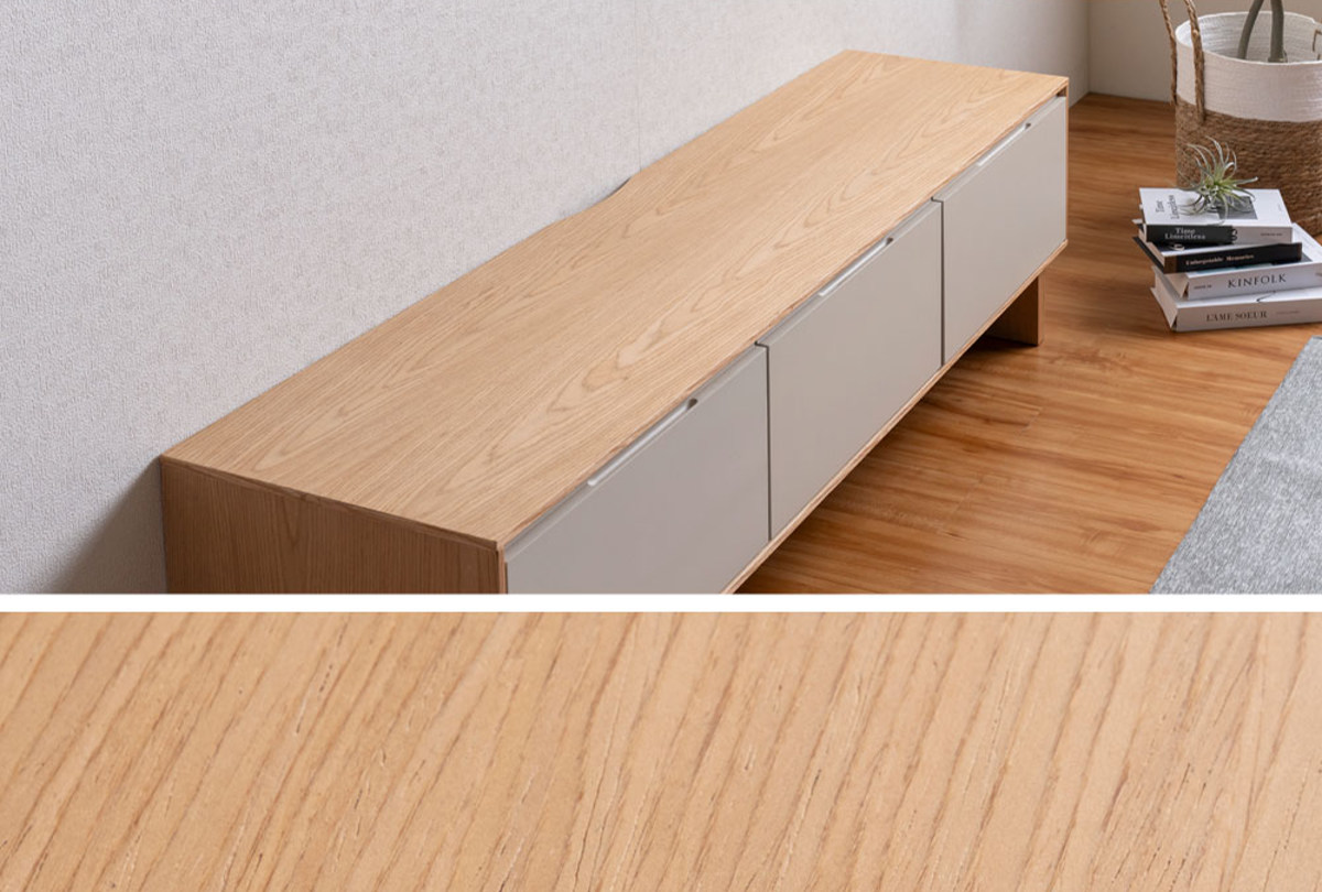 環境に配慮したFSC認証を取得した天然木工芸突板を使用したテレビボードです。ナチュラルなフレームとグレージュのツートンカラーが、空間に明るさと優しさをプラスします。テレビボードとしてだけでなく、ロータイプのディスプレイ棚としてもお使いいただけます。