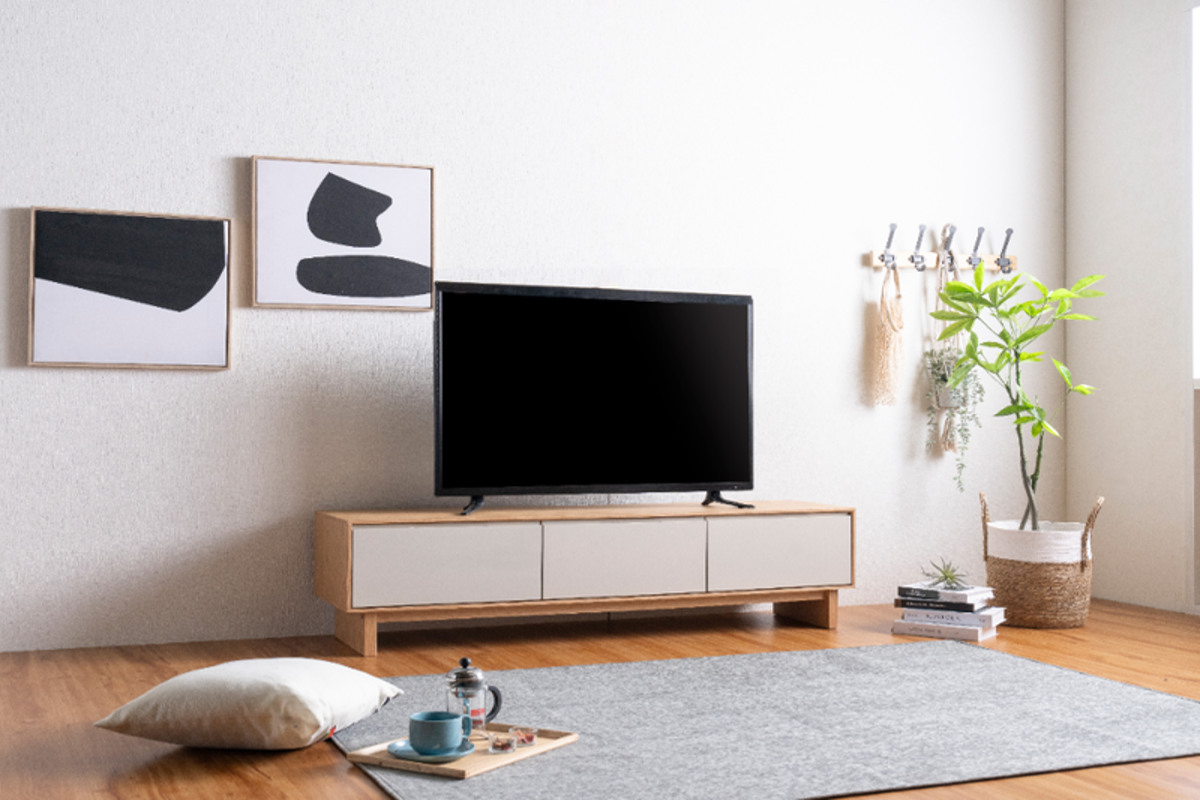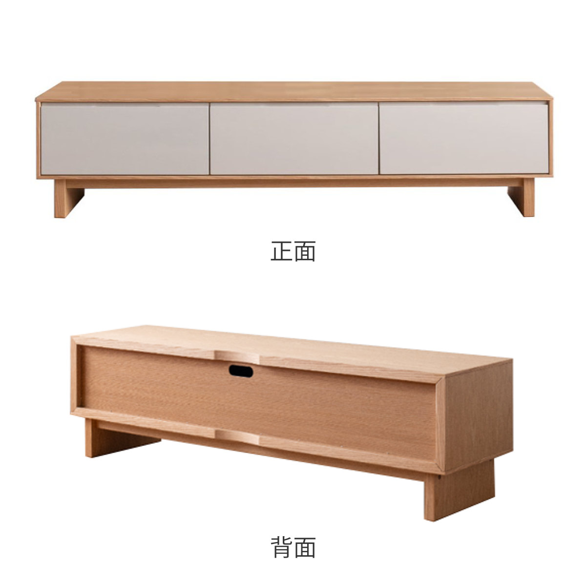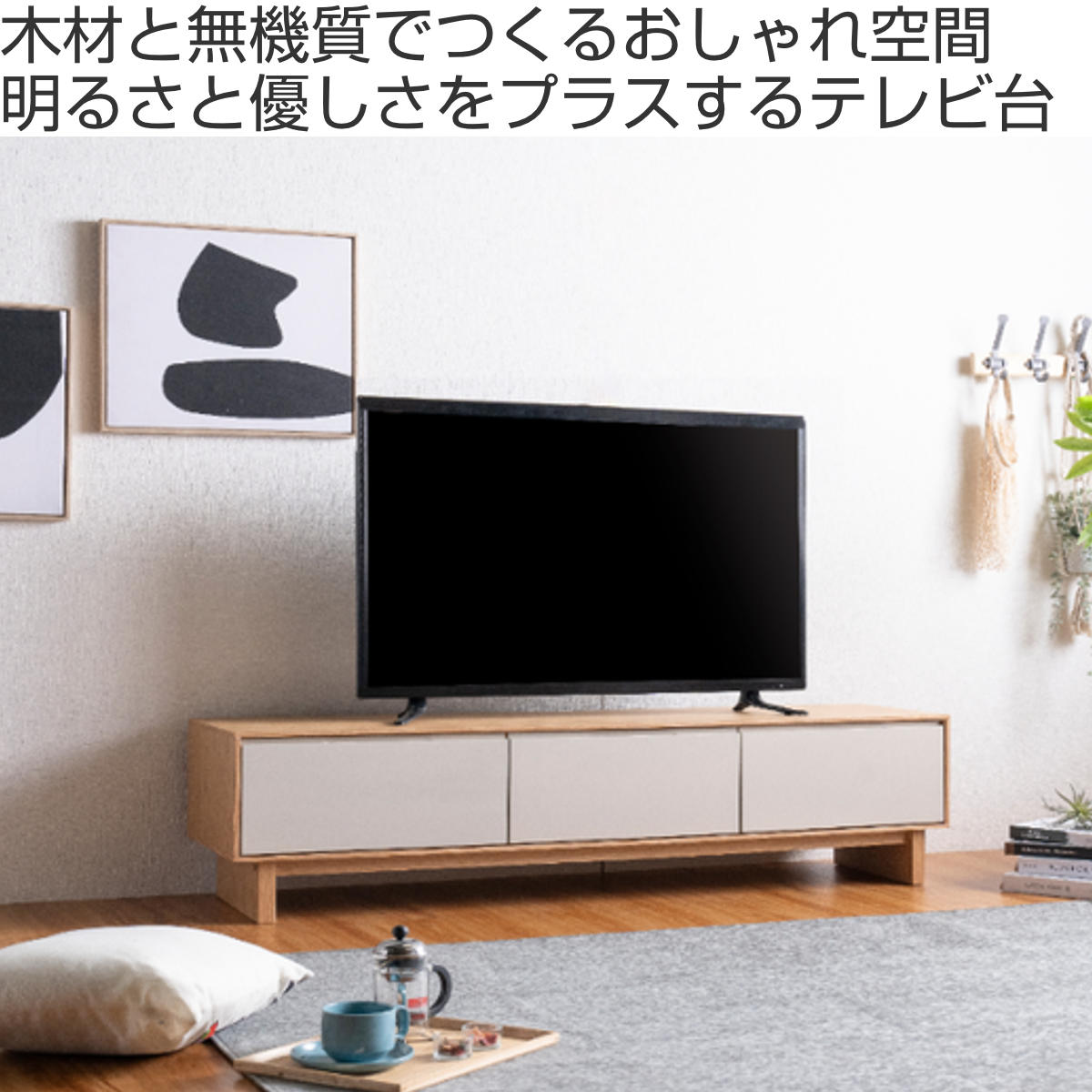 環境に配慮したFSC認証を取得した天然木工芸突板を使用したテレビボードです。ナチュラルなフレームとグレージュのツートンカラーが、空間に明るさと優しさをプラスします。テレビボードとしてだけでなく、ロータイプのディスプレイ棚としてもお使いいただけます。