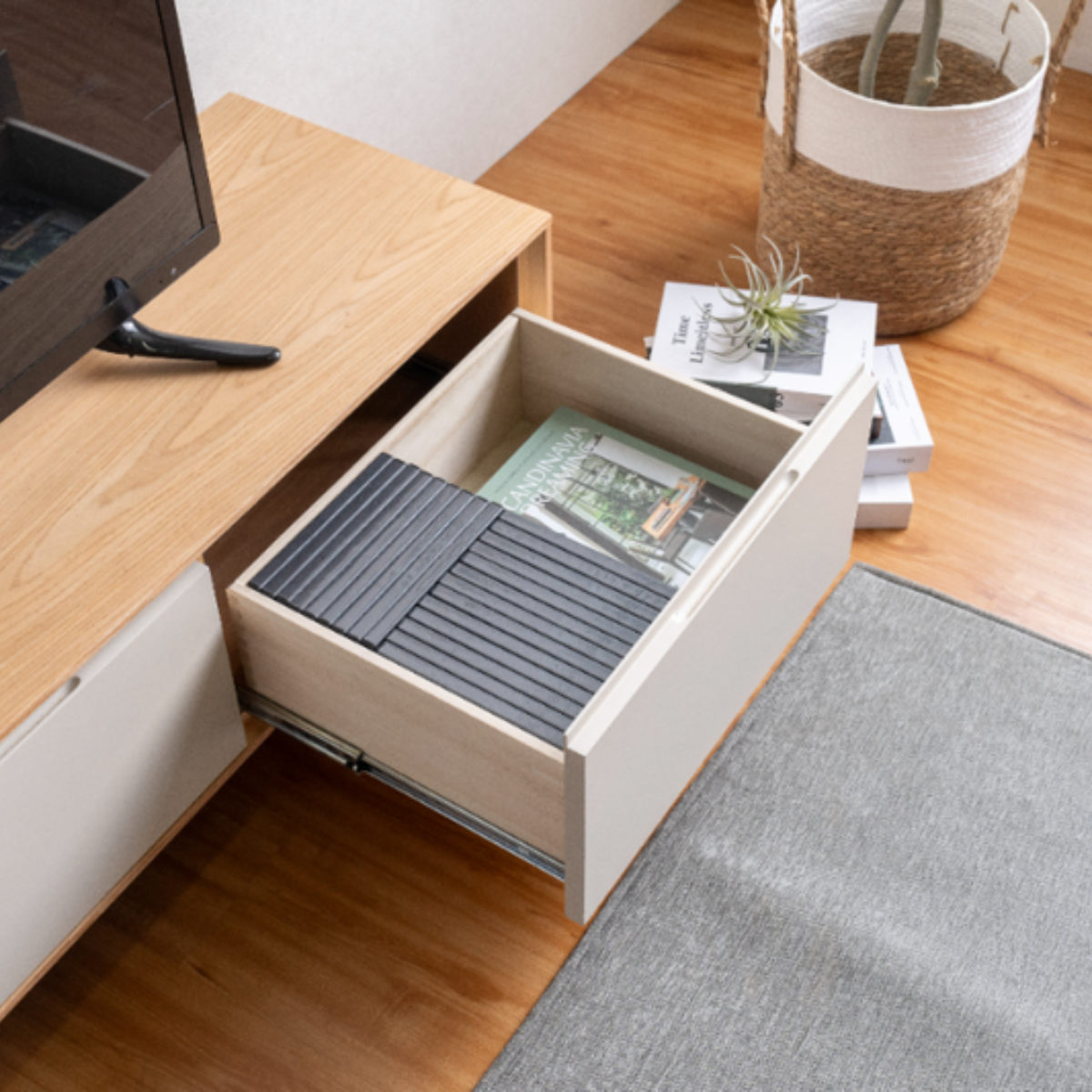 リビング周りの小物やDVDケースの収納に最適な深さ13cmの引出しは、フルスライドレール仕様で奥までしっかりと見渡せます。DVDなどをたっぷり収納しても、スムーズに開閉ができます。ストッパー付きなので、万が一引き出しすぎてしまっても抜け落ちる心配がありません。