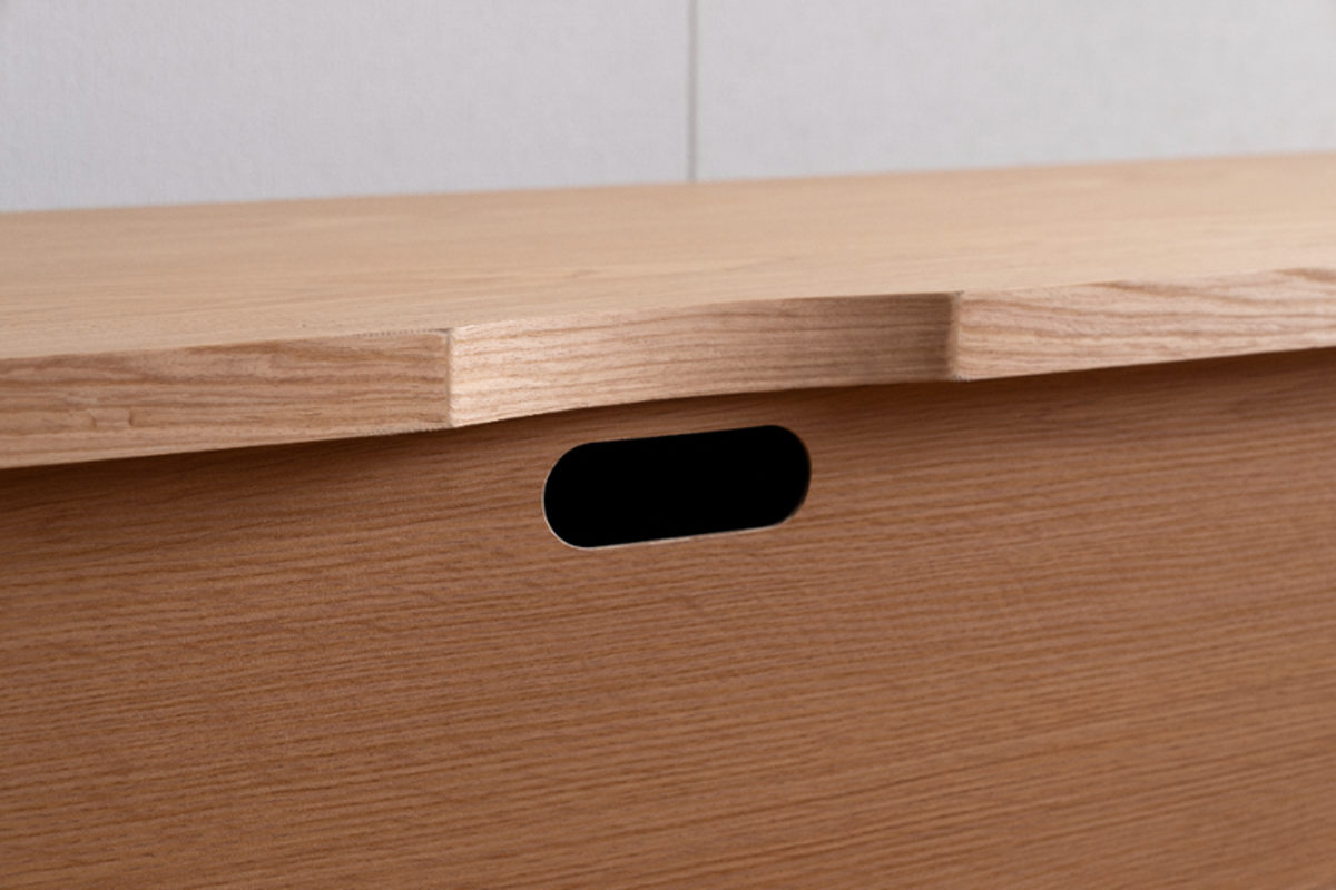 引出しにはあえて取っ手は付けず、上部の窪みに指を掛けて開閉します。イメージを損なわない、細かい仕上げにもこだわりが感じられます。