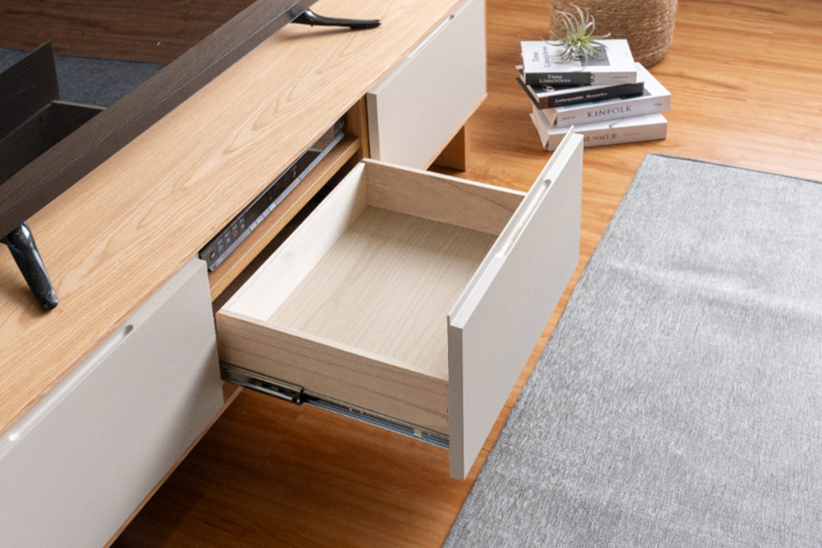 大きな引出しを開けると、上段にはデッキなどのAV機器を収納するのに最適な棚が。下段は深さ6.5cmの引出しで、雑誌やリモコンなどの収納にぴったり。こちらもフルスライドレール仕様なので、奥にしまったものまで手に取りやすく開閉がスムーズです。
