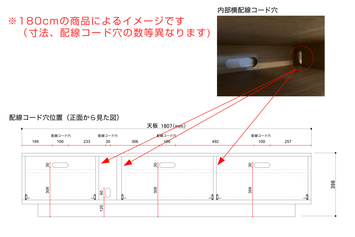 天板にはコードを通すスリット、背面には配線コード穴、引出しと引出しの間の仕切壁には、横配線コード穴があります。テレビやAV機器の配線が簡単にでき、スッキリと見せることができます。