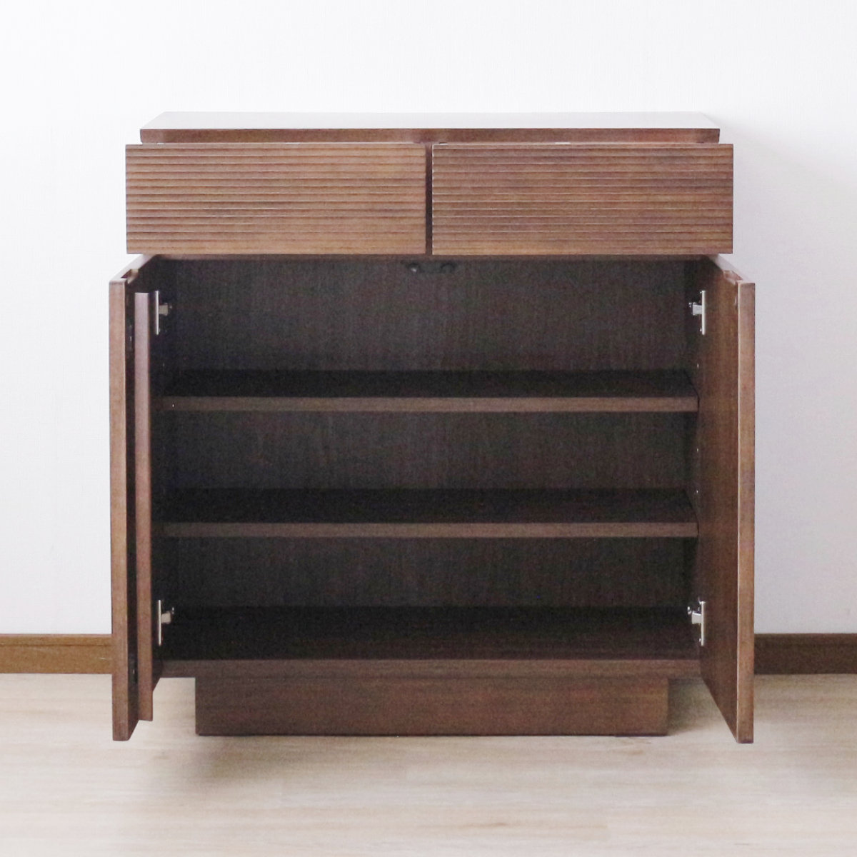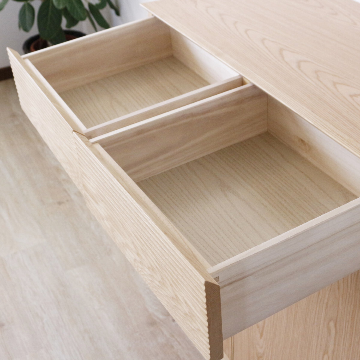 引出しは桐製で、凸凹をかみ合わせるロッキング組みがされており丈夫です。フルオープンで奥の方の物も出し入れしやすいです。引出しの前板には天然木を使用しており、表面にルーバー加工を施すことで、細やかなラインが揃い、スタイリッシュに仕上がっています。