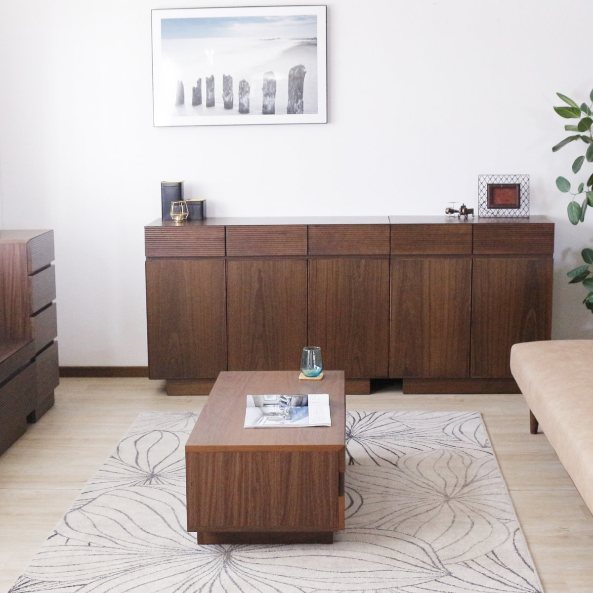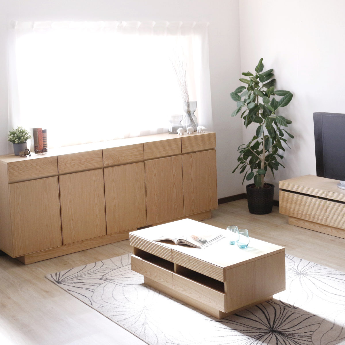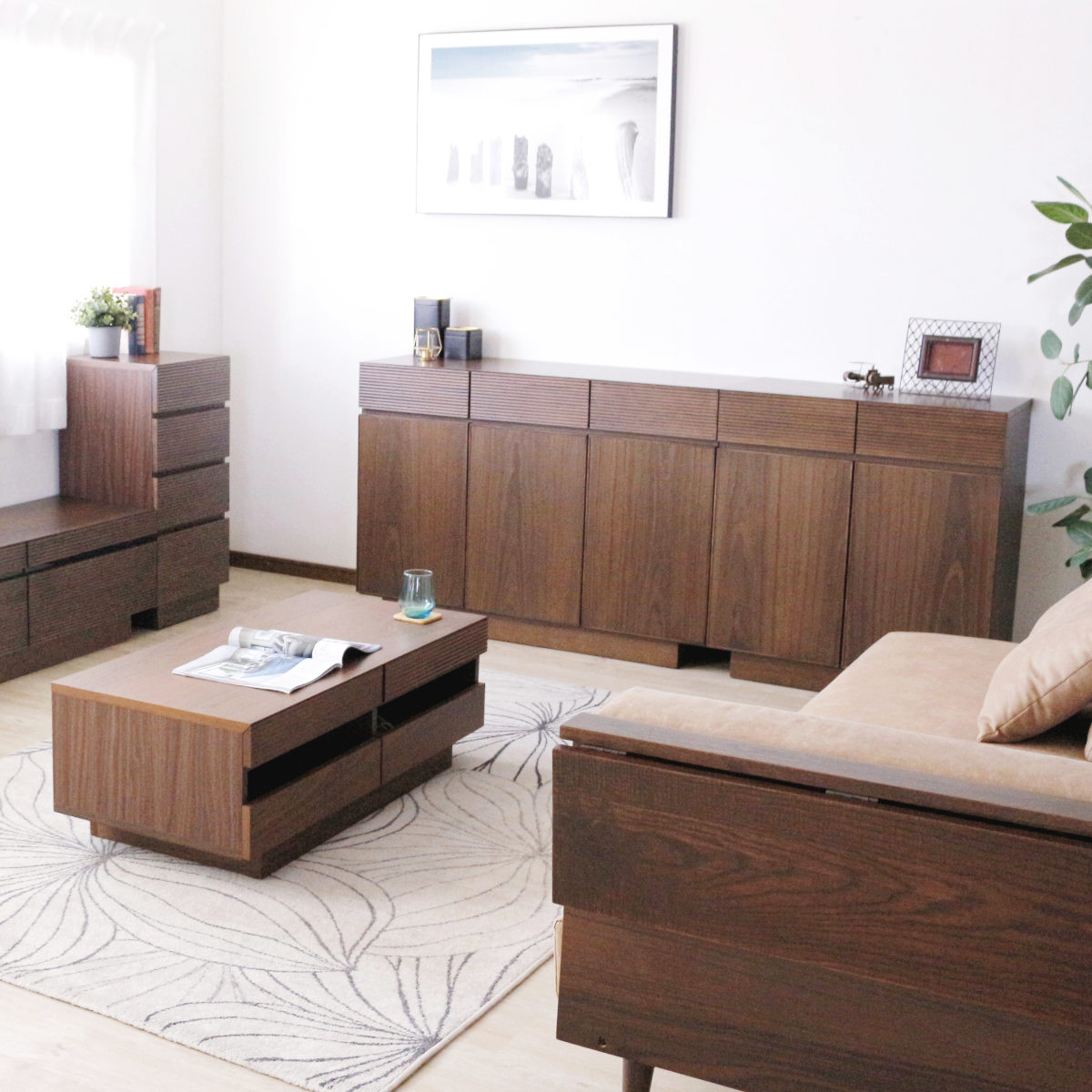 同じシリーズのテレビボードやサイドチェストと併せて使えばお部屋に統一感が出ます。また、幅80cmと120cmのサイドボードを組み合わせれば、収納力抜群の大容量リビング収納としてお使いいただけます。