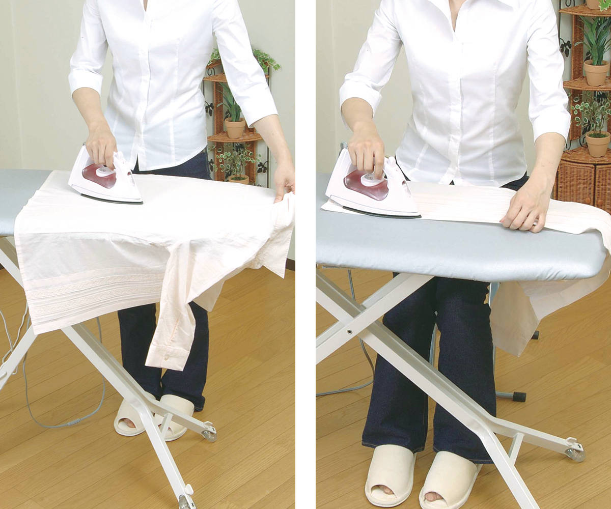 ワンタッチレバーで簡単に高さ調節が可能です。立って、座って、自由な高さでアイロンがけができます。
