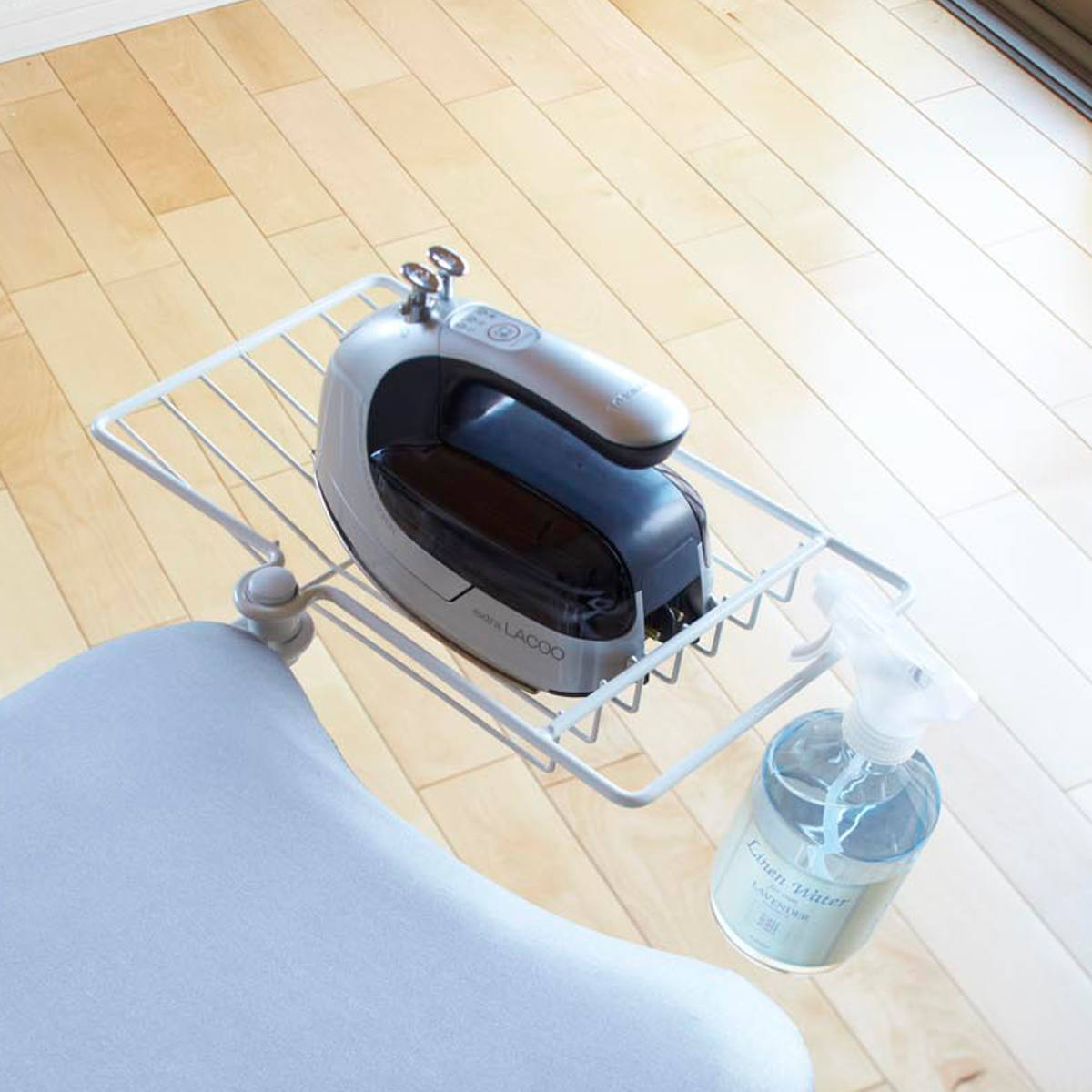 アイロンがけで使うスプレー等の小物を引っ掛けて収納できます。コードレスアイロンもしっかり置ける便利な回転式の置き台です。