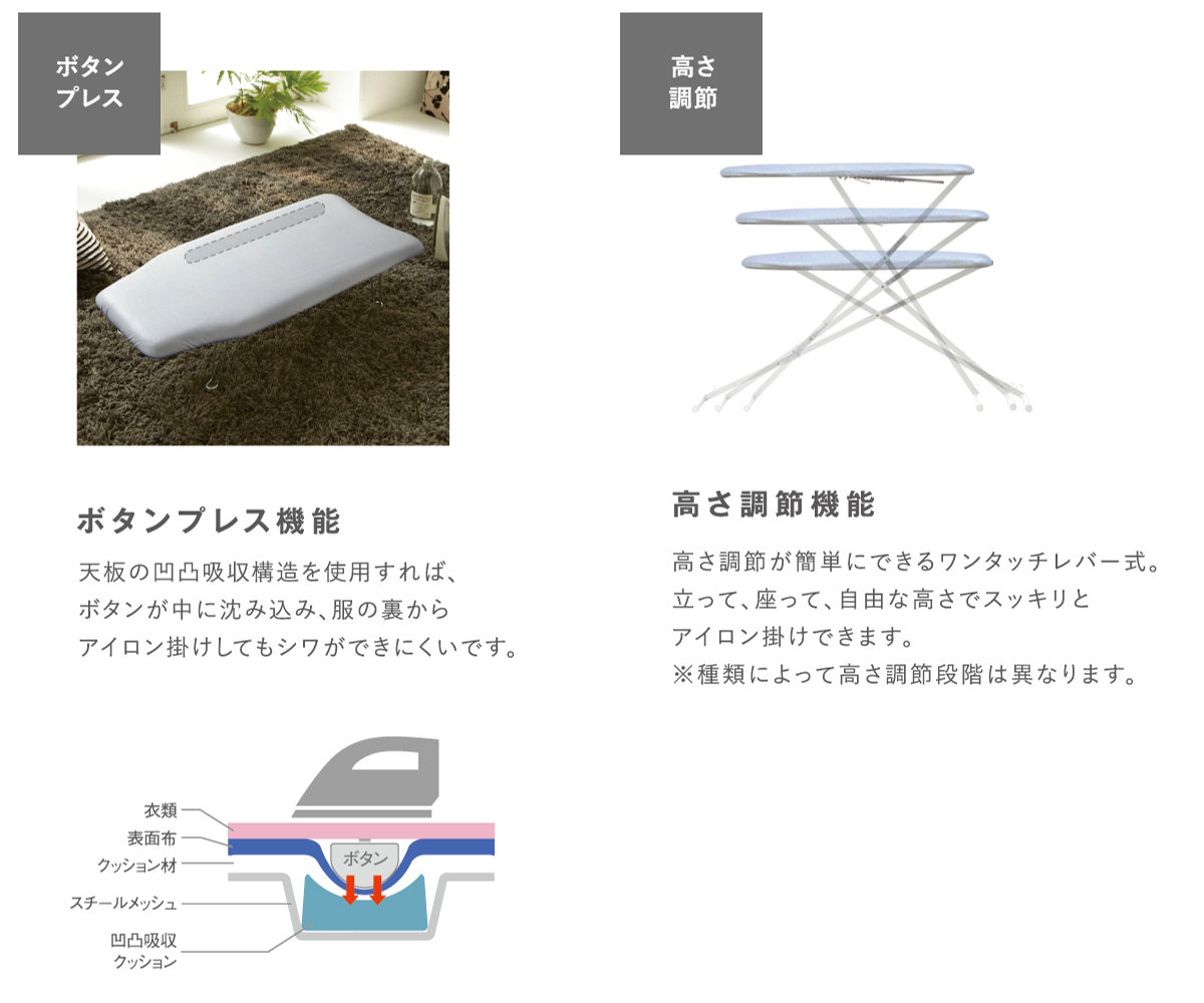 アイロン台の一部が凹凸吸収構造になっているので、ボタンが沈み込んでアイロンがけをキレイに仕上げることができます。