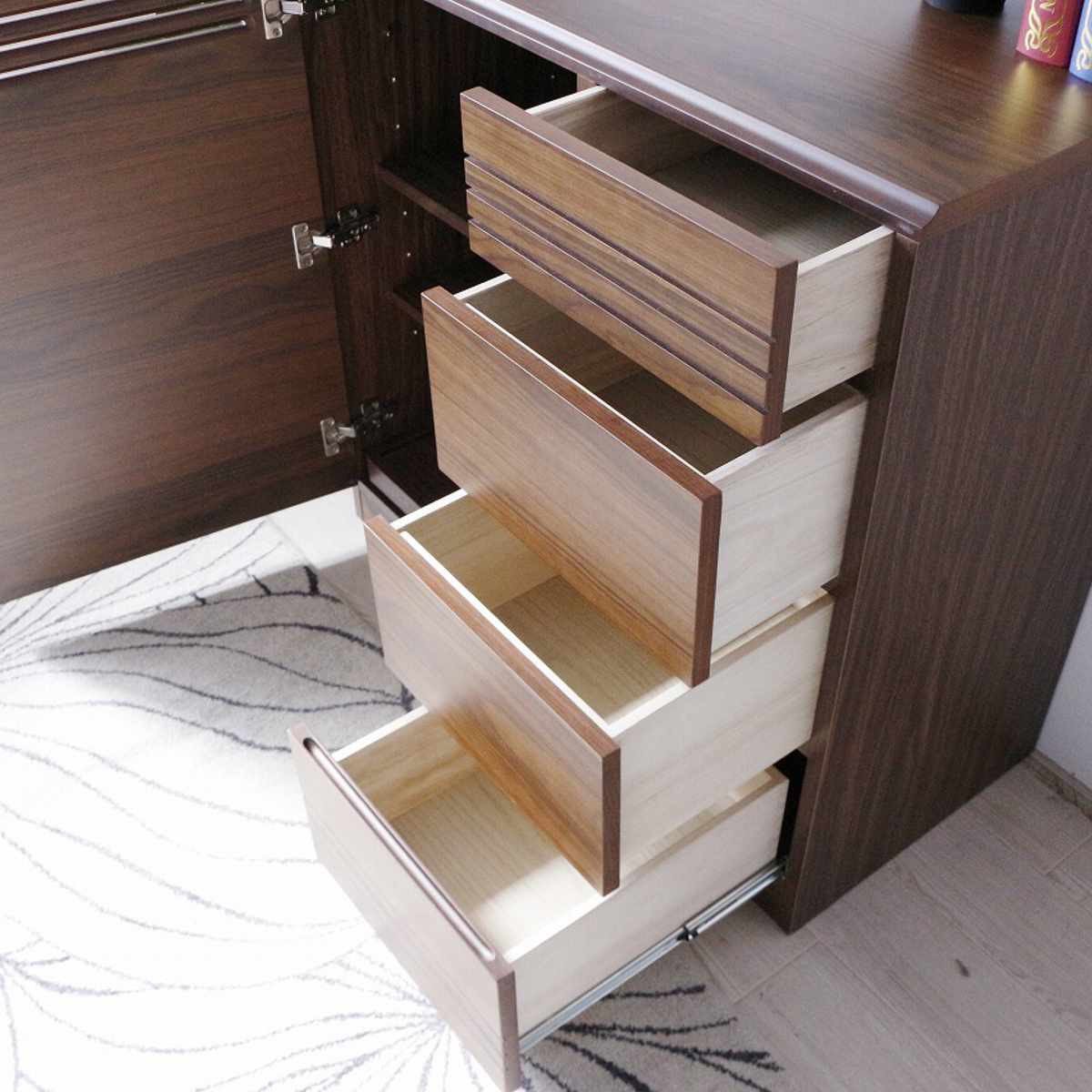 伝統的なロッキング加工で耐久性に優れた引出しは、内部には湿気や虫に強く変形しにくい上質な桐材を使用し長くお使いいただけます。最下段の引出しはフルスライドレール仕様で、奥までしっかり見渡せます。