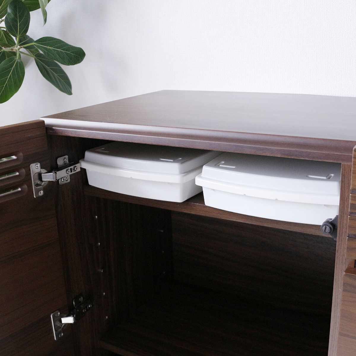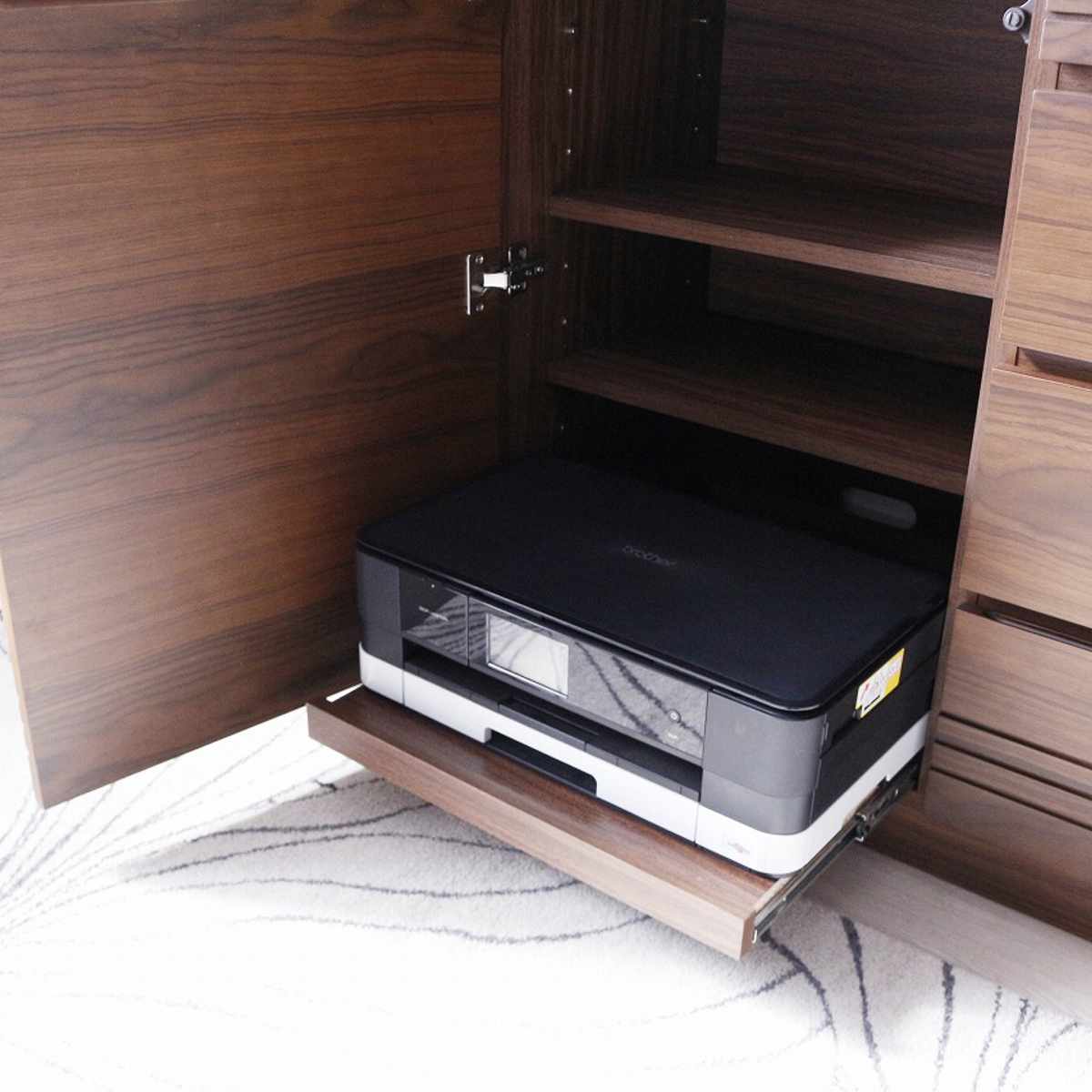 左扉の下段にはプリンターを収納でき、必要な時はスライドして手前に引き出せます。置き場所に困りがちなプリンターも無駄なく収まり、使いやすさをしっかり考えた設計です。