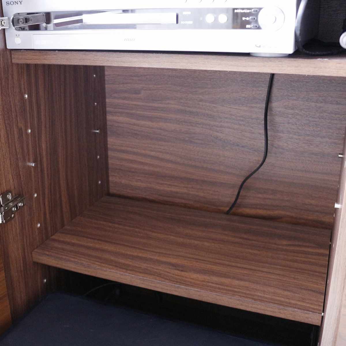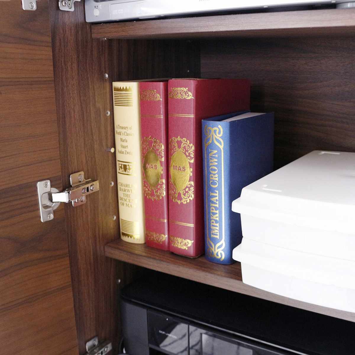 左扉内の棚板は可動式で、高さを自由に調節可能。A4ファイルや雑誌などもすっきり収まり、収納スペースを無駄なく活用できます。