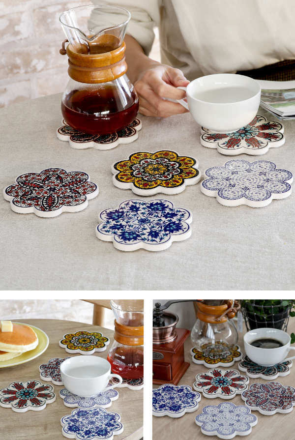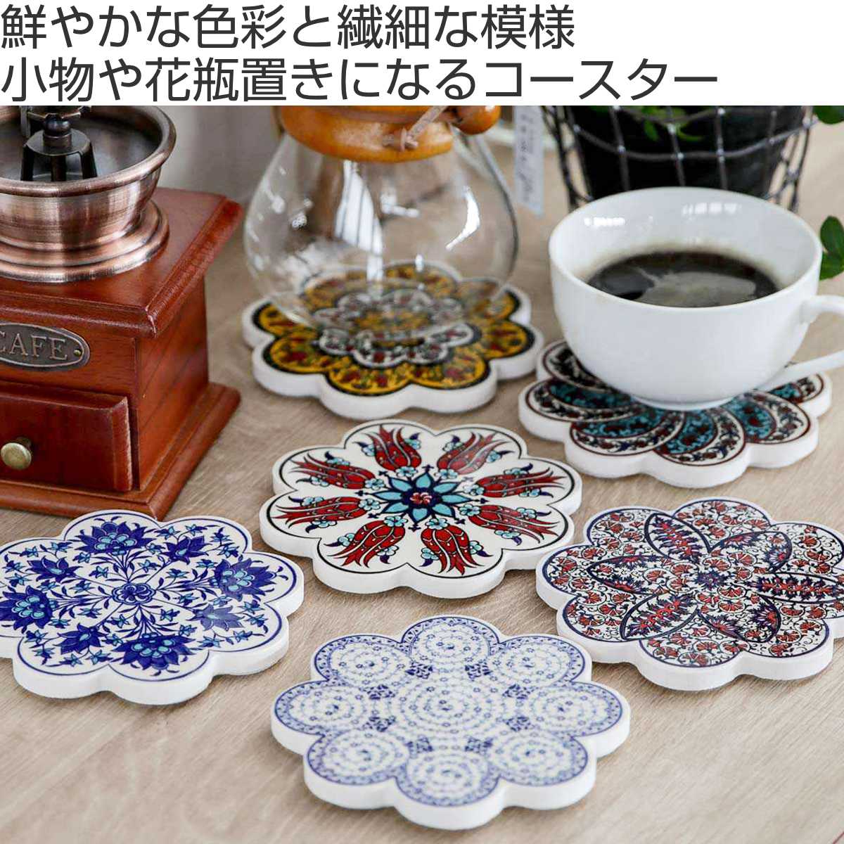 お部屋の雰囲気をぱっと明るくする陶器製のコースターです。同じ模様を繰り返し描いた幾何学模様や、チューリップやカーネーションをモチーフにした植物模様が特徴的です。存在感のあるデザインでカップを置くだけでおしゃれに見えそうです。