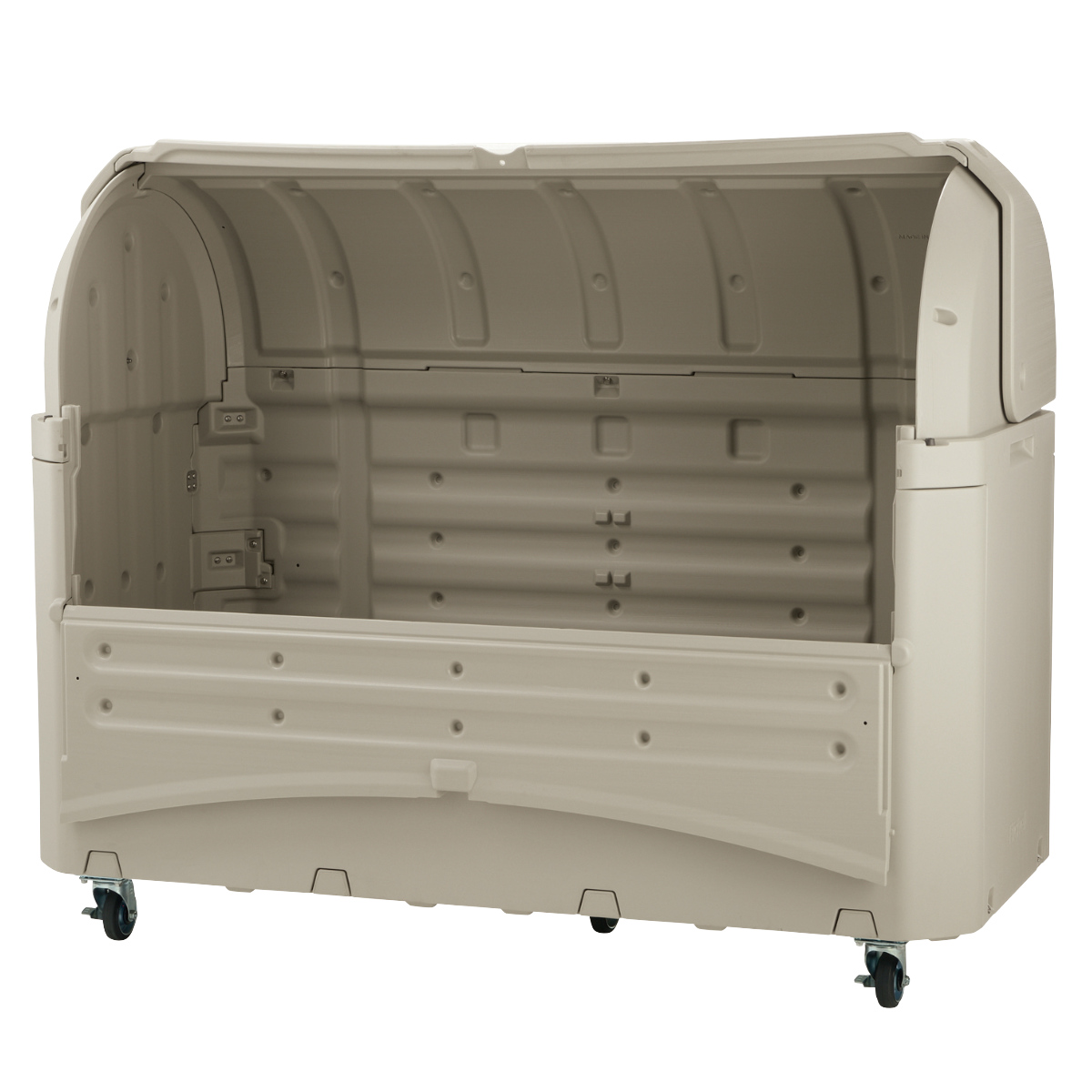 軽量スライド蓋でゴミ捨てがもっと楽になる集積保管容器です。ゴミの入った45Lポリ袋が約33個入ります。本体底部には固定穴、南京錠がかけられるカギ穴付きです。