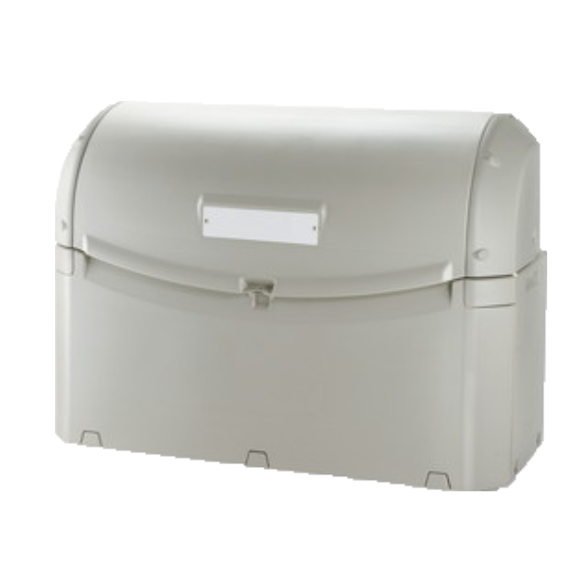 軽量スライド蓋でゴミ捨てがもっと楽になる集積保管容器です。ゴミの入った45Lポリ袋が約17個入ります。本体底部には固定穴、南京錠がかけられるカギ穴付きです。
